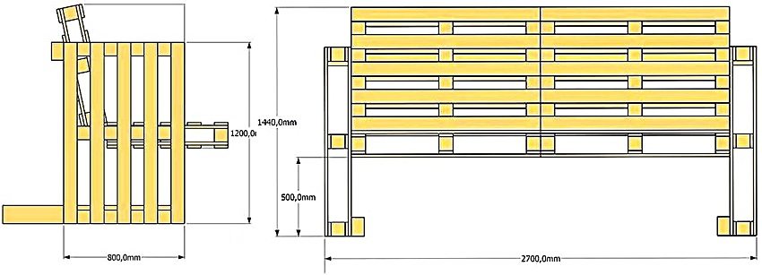 Reka bentuknya sangat sederhana dalam pelaksanaan sehingga gambar tidak diperlukan untuk membuat bangku kayu dari palet dengan tangan anda sendiri. Untuk melakukan ini, cukup menggunakan imaginasi anda.