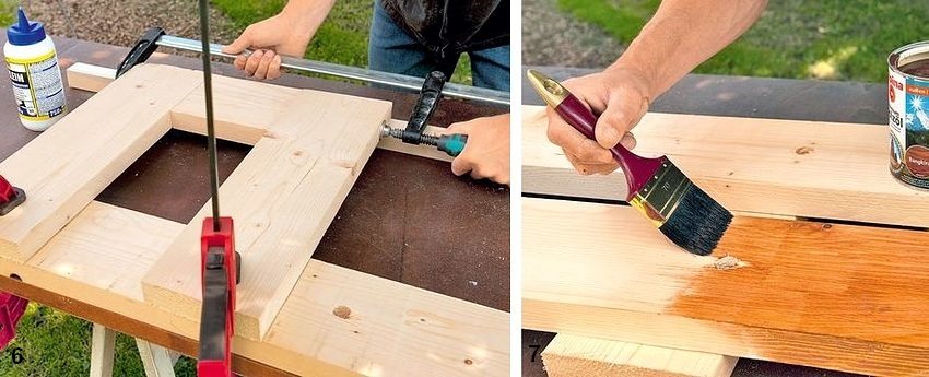 Gambar: 1-4. Prosedur untuk membuat bangku taman dari papak kayu dan konkrit: 6 - mengumpulkan bahagian belakang; 7 - lapisan bahagian kayu dengan larutan antiseptik