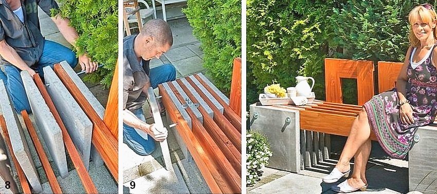 Gambar: 1-5. Prosedur untuk membuat bangku taman dari papak kayu dan konkrit: 8 - pemasangan bahagian utama; 9 - memasukkan dan mengikat batang berulir