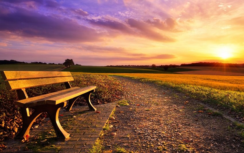 Bangku kayu yang dicat dengan warna kuning yang ceria sesuai dengan reka bentuk keseluruhan kawasan rekreasi