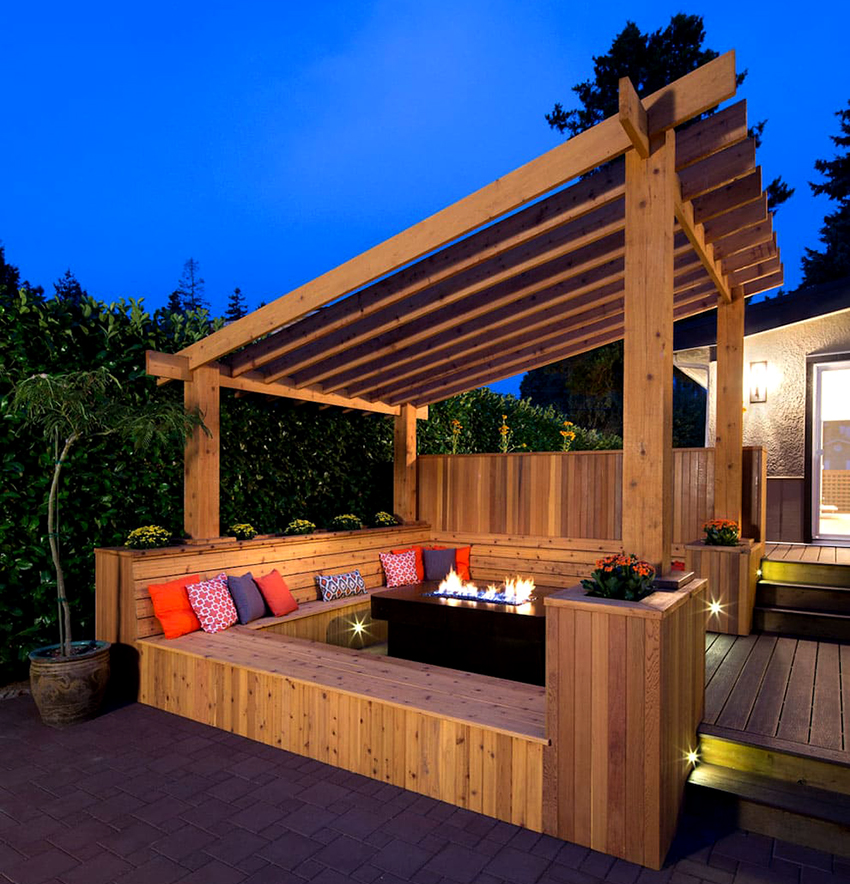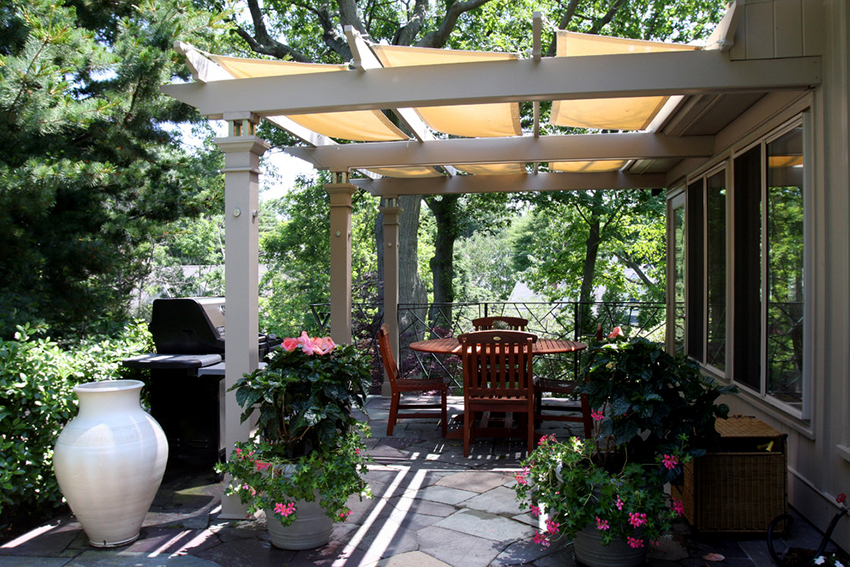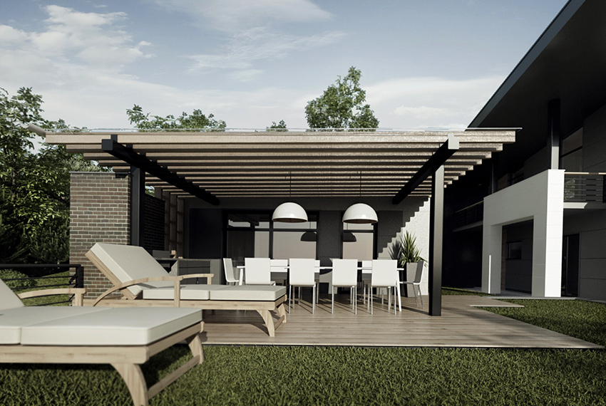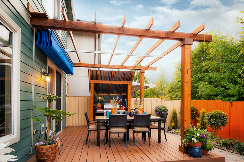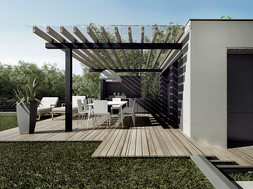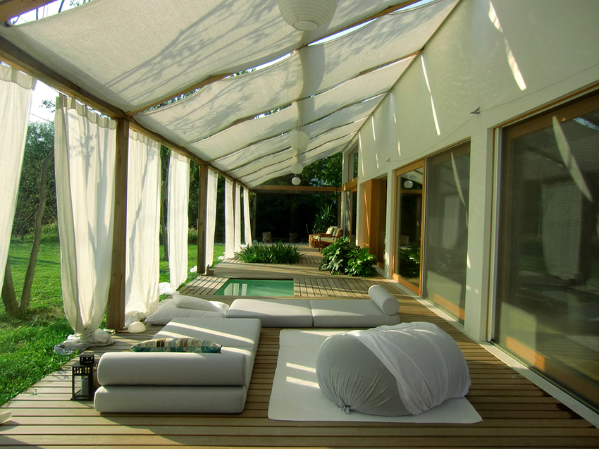 Laman web ini sering digabungkan dengan pergola dan arbor, menghubungkannya dengan pelbagai lorong, jalan, langkah. Adalah tidak biasa untuk menggabungkan dek musim panas dengan kolam renang.