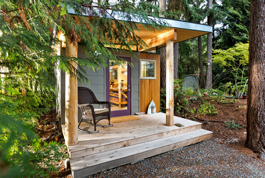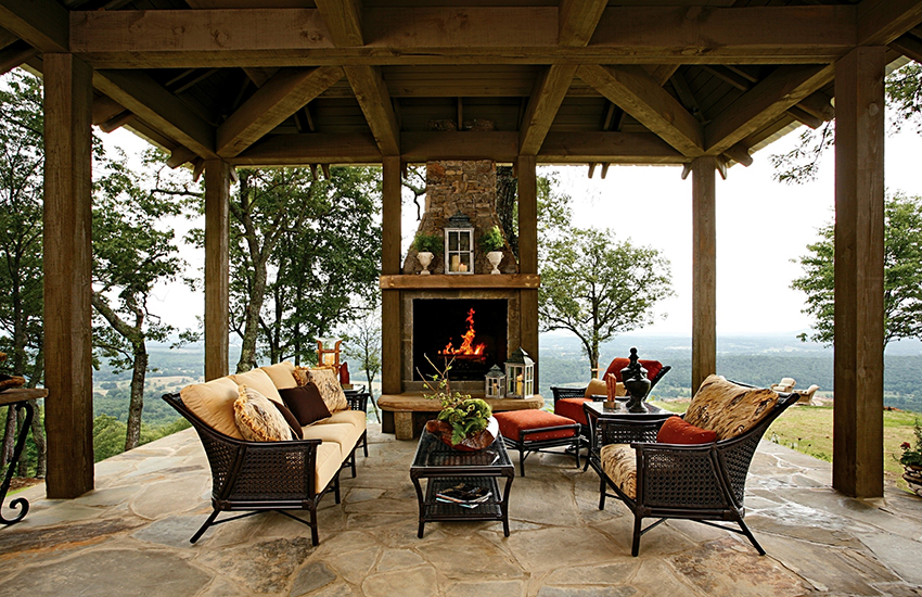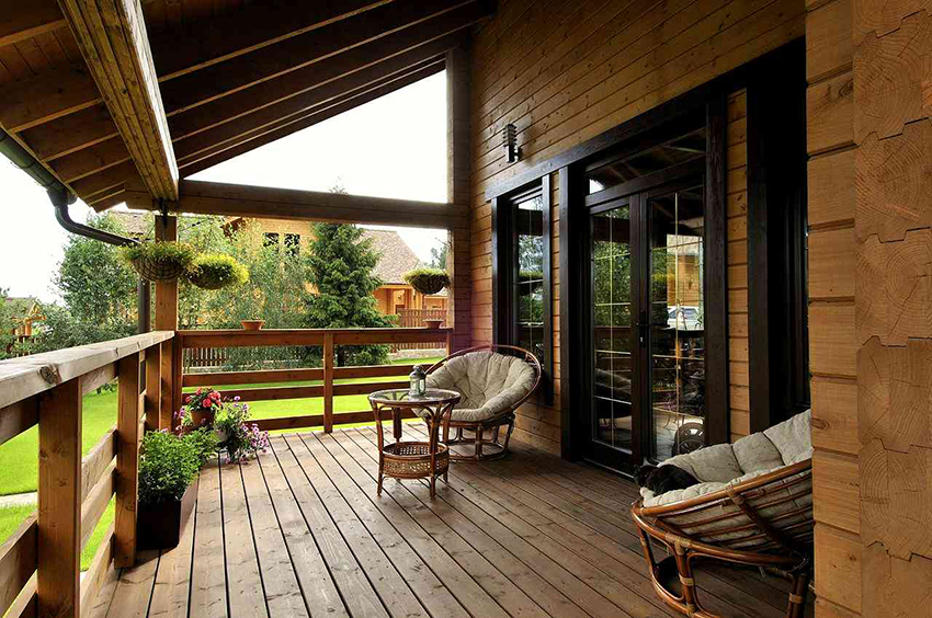 Chalet. Penyelesaian yang ideal untuk beranda kayu yang terpasang di rumah. Yang terbaik adalah mendirikan struktur menggunakan bar dan menghiasnya dengan pagar besi tempa. Dianjurkan untuk mengatur perabot kayu padat, dan gunakan papan dek atau log sebagai lantai. Tidak boleh ada bahagian plastik atau garis lurus yang jelas. Dalam kes ini, brazier atau kompor akan kelihatan sangat relevan.