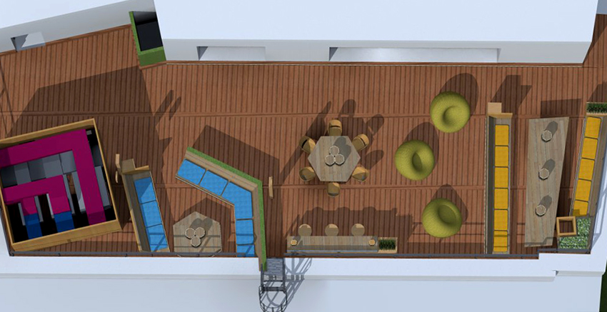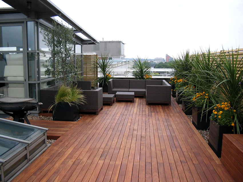 Anda sering dapat menemui organisasi rumput dengan rumput asli atau tiruan. Di samping itu, hiasan dalam bentuk tanaman eksotik dalam pasu akan kelihatan cantik. Nuansa seperti itu harus dipikirkan terlebih dahulu, kerana tumpang tindih harus dirancang untuk menahan massa seperti itu (dengan mempertimbangkan berat orang yang akan berada di sana). Kanopi untuk struktur sedemikian boleh dibuat pegun atau boleh ditanggalkan.