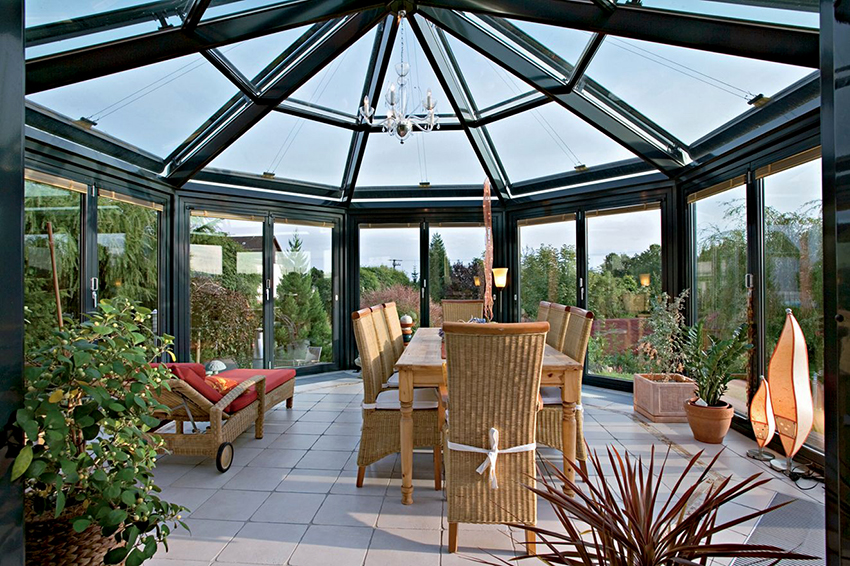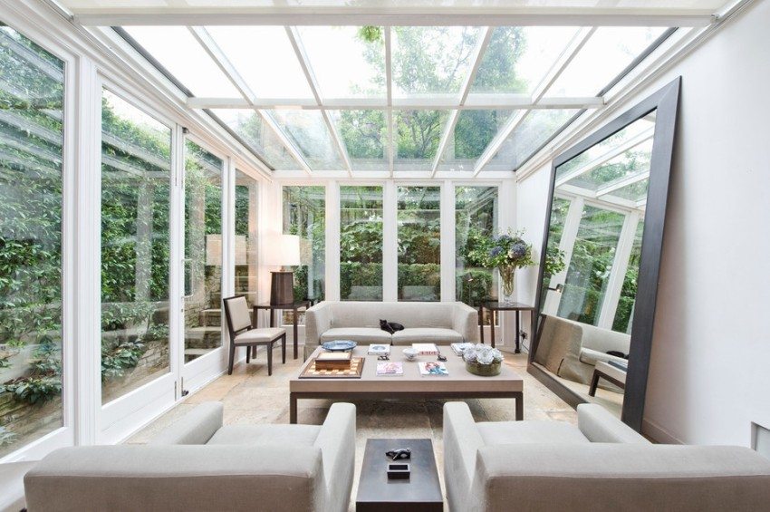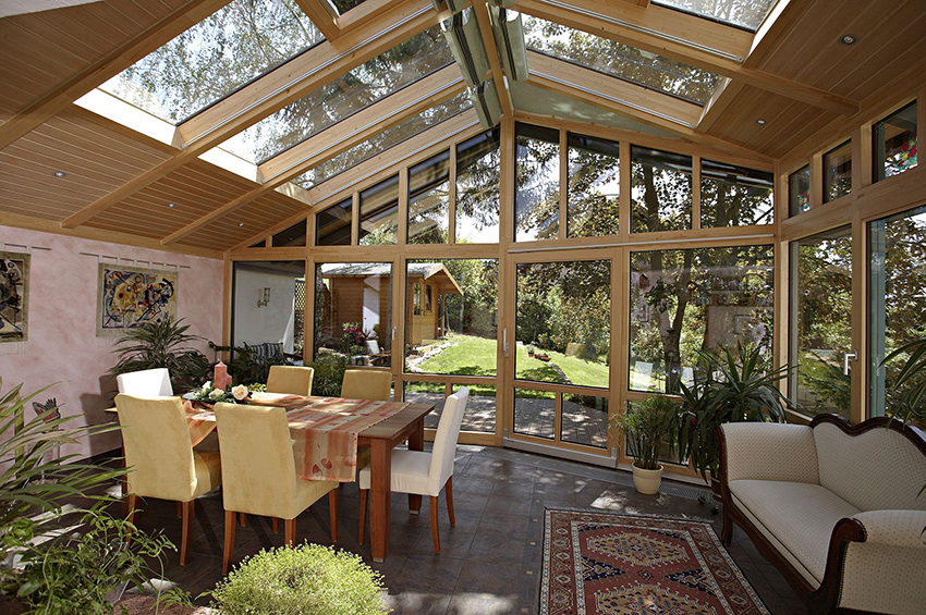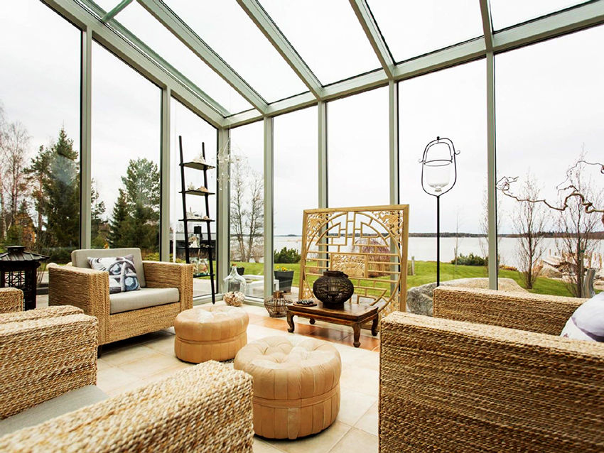 - Reka bentuk lut sinar semakin meluas. Kerangka beranda diperbuat dari batu bata atau balok tebal sehingga penyokong kaca kuat. Tingkap kaca berganda atau tiga dipasang di bukaan.