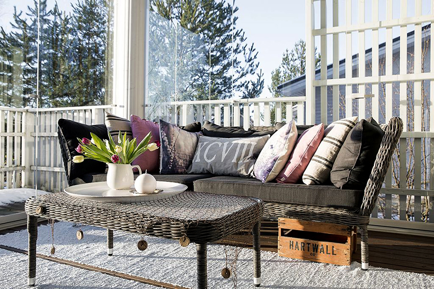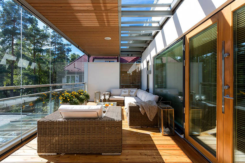 Di beranda yang luas dan terang, dibenarkan untuk bereksperimen dengan bahan yang dipilih, tidak perlu bersusah payah dengan pilihan warna dan melakukan apa sahaja mengikut keinginan anda. Terutama ketika datang ke penambahan beranda tertutup ke rumah. Anda juga tidak perlu menjimatkan perabot yang dipilih, anda boleh meletakkan semua yang diperlukan. Perkara utama adalah tidak terbawa-bawa dengan susunan objek, kerana walaupun ruang yang luas dapat dengan mudah dibebani perabot.