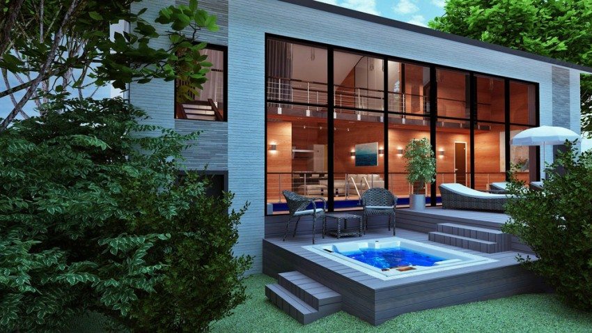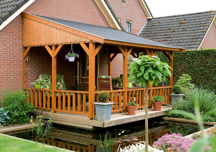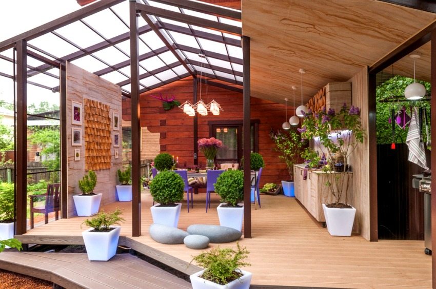 Seperti banyak gambar sambungan teres ke rumah jenis ini, mereka sering dilengkapi dengan kolam kecil. Waduk buatan boleh kembung, dibuat dari tempat mandi lama, dan juga kolam renang yang lengkap (bergantung pada kemampuan kewangan pemiliknya). Zon sering disusun di teras B-B-Q, dengan selamat melindungi penebat kayu dari kesan suhu tinggi.