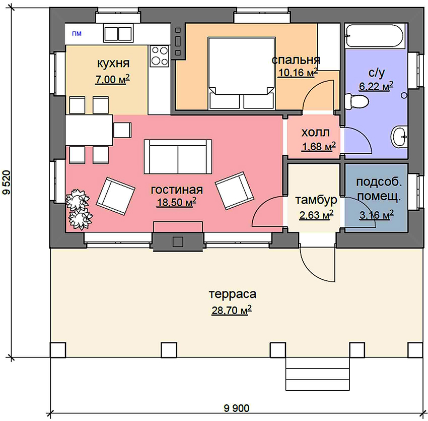 Sekiranya rumah itu selalu digunakan oleh beberapa orang, anda tidak boleh memperuntukkan banyak ruang untuk pembinaan. Dalam kes ini, perkara utama ialah kerusi yang selesa dengan meja sesuai di sini, yang membolehkan anda menghabiskan waktu malam yang selesa di sebuah syarikat kecil. Untuk ini, 8-10 m² akan mencukupi.