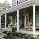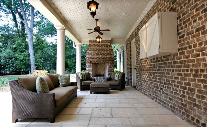 - Beranda bata dipasang di atas landasan yang kukuh. Reka bentuk menggunakan batu bata dengan warna yang berbeza, yang dibezakan oleh pedimen, tiang atau sudut.