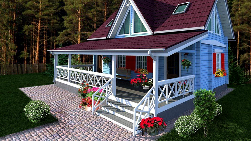 Kawasan ini juga dipengaruhi oleh jenis bangunan yang dipilih. Sebagai contoh, jika beranda segi empat tepat dirancang, panjangnya biasanya dalam jarak 4-6 m, dan lebarnya 2,5-4 m. Di beranda berbentuk persegi, semua dinding harus memiliki ukuran yang sama. Sebilangan besar pemilik lebih suka mendirikan struktur dengan bentuk yang serupa dengan sisi bangunan. Sekiranya bangunan utama mempunyai bentuk yang tidak biasa, maka lebih baik membuat beranda dalam bentuk segitiga atau separuh bulatan - semuanya bergantung pada imaginasi pemiliknya. Bentuk bangunan masa depan juga mempengaruhi reka bentuk luaran bumbung: