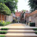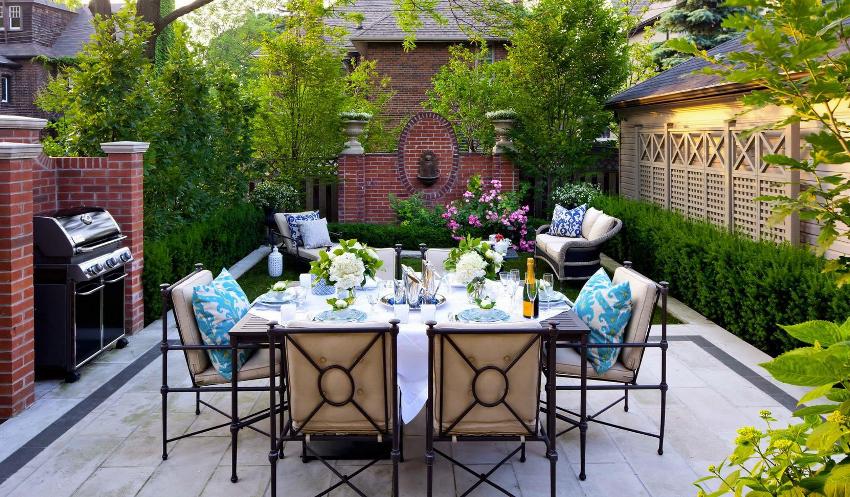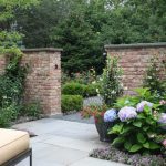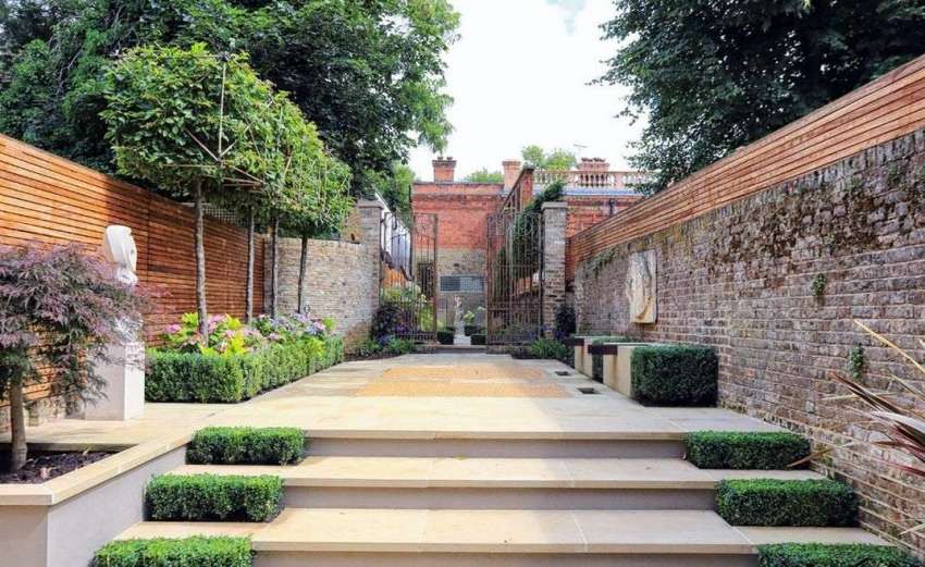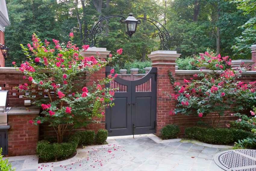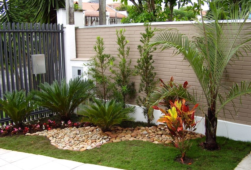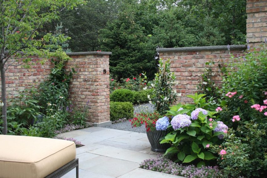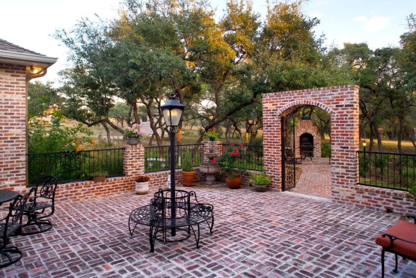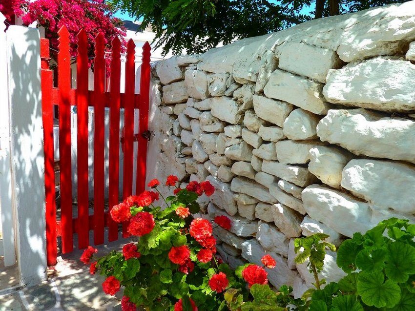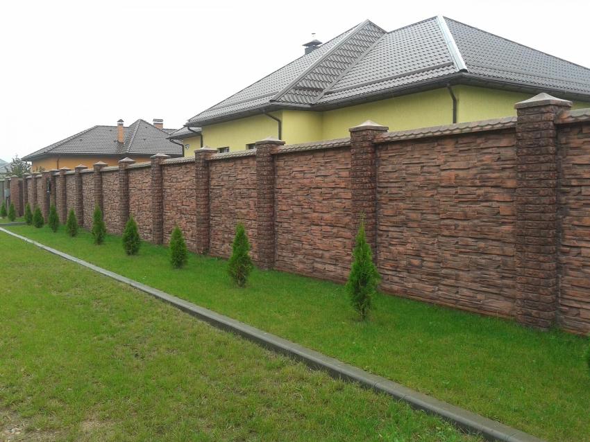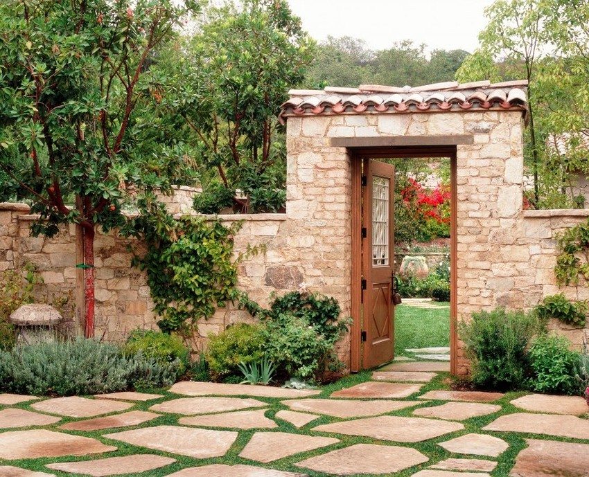 Pagar batu dan bata kelihatan sama sempurna dari kedua belah pihak: dari jalan mereka menceritakan selera pemilik yang sesuai, dan dari sisi halaman mereka sesuai dengan kehijauan penanaman.