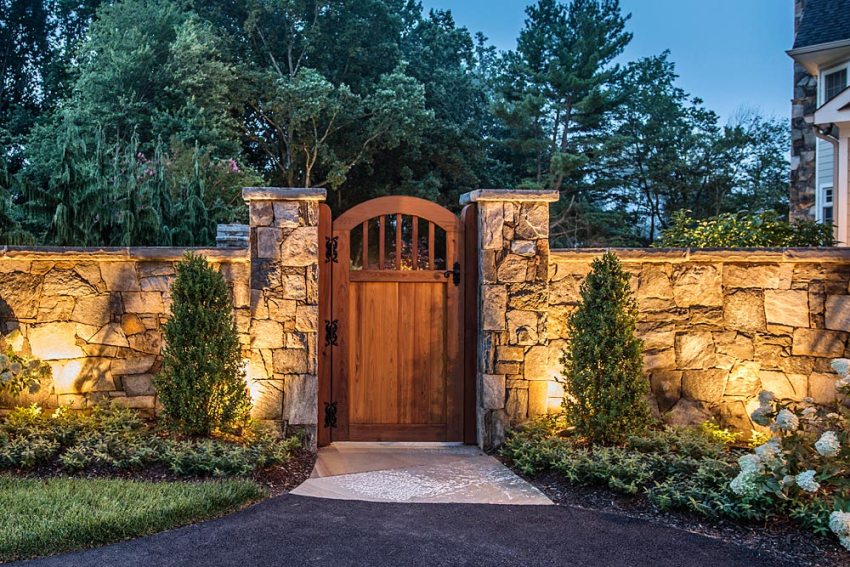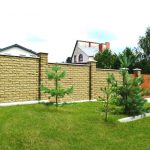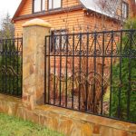 Sekiranya unsur-unsur seni bina batu semula jadi digunakan di lanskap laman web ini, maka gabungan kepingan berprofil dan tiang batu adalah logik. Pagar seperti itu kelihatan volumetrik dan secara luarannya tidak kalah dengan struktur yang lebih mahal.