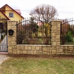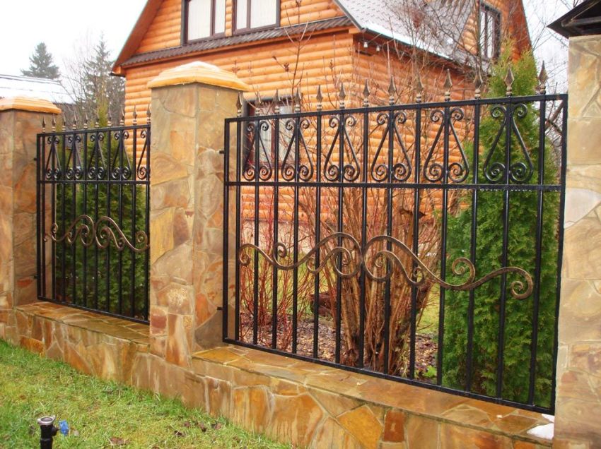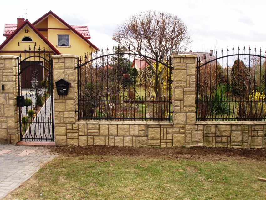 Menggabungkan pagar batu dengan penempaan artistik menghasilkan ikatan yang luar biasa. Bahan saling melengkapi dengan sempurna, terutamanya jika pintu pagar dan pintu masuk diperbuat daripada logam palsu.