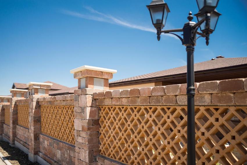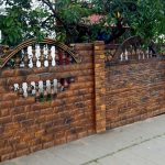 Anda boleh menjadikan pagar bata lebih menarik dengan menggunakan tekstur dan warna bahan yang berbeza. Versi klasik: tiang dan parapet dihadapkan dengan batu bata dengan tekstur atau warna yang sama, dan span itu sendiri terbuat dari bahan dengan warna dan kualiti yang berbeza. Adalah mungkin untuk memberikan pagar yang lebih terang jika anda membuat beberapa baris, misalnya yang atas dan bawah, dengan celah kecil atau meletakkan batu bata pada garis-garis ini pada sudut.
