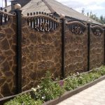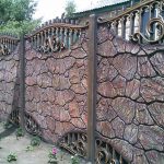 Anda boleh memberikan pagar yang terbuat dari papan bergelombang yang indah dengan menggabungkan kepingan dengan sisipan palsu. Dalam kes ini, untuk pagar, anda perlu membuat bingkai logam di mana unsur-unsur palsu akan dikimpal dan kepingan berprofil akan dilekatkan. Dan digabungkan dengan tiang yang dilapisi batu atau bata, pagar seperti itu akan kelihatan elegan dan mahal.