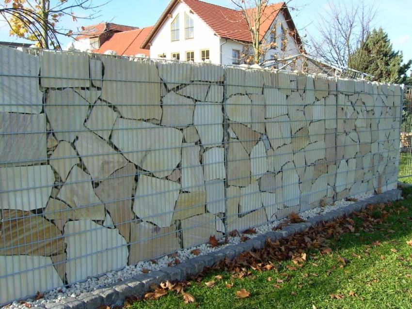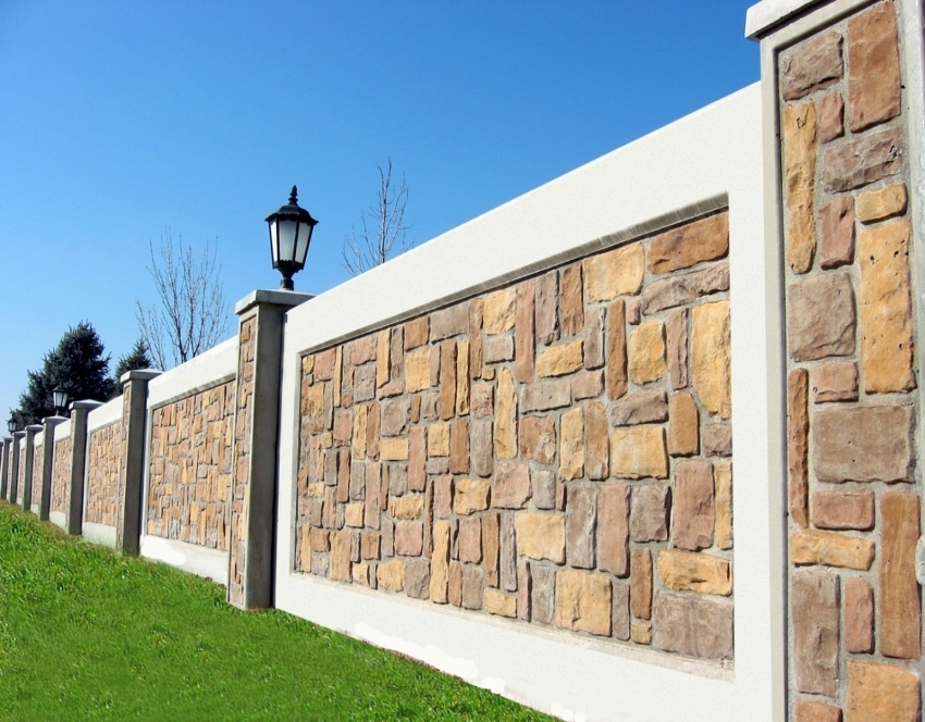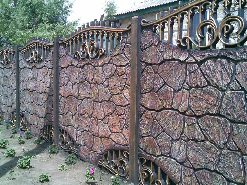 Sebagai tambahan kepada fakta bahawa pagar batu adalah struktur yang mencukupi untuk diri mereka sendiri, mereka tidak dapat digabungkan dengan bata, kayu, unsur-unsur palsu dan bahan lain. Foto pagar piket, penyokong menegak yang dilapisi dengan batu semula jadi, mengesahkan bahawa gabungan sedemikian secara serentak mendorong pagar piket yang murah dan meringankan struktur batu.