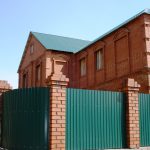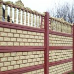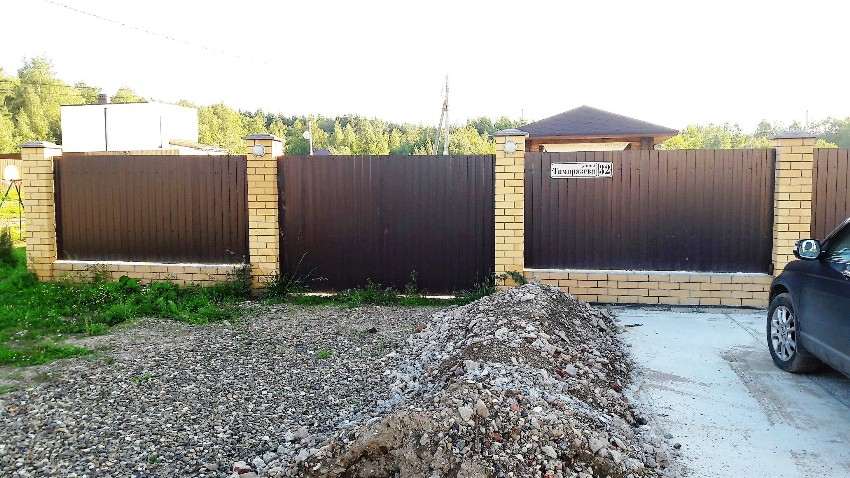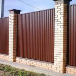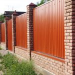 Peranti pagar yang terbuat dari papan bergelombang dengan tiang bata memberikan struktur yang sama sekali berbeza. Foto pagar yang diperbuat daripada bata dan papan beralun membuktikan bahawa pagar yang baik dan kukuh dapat dibina dari bahan-bahan ini.