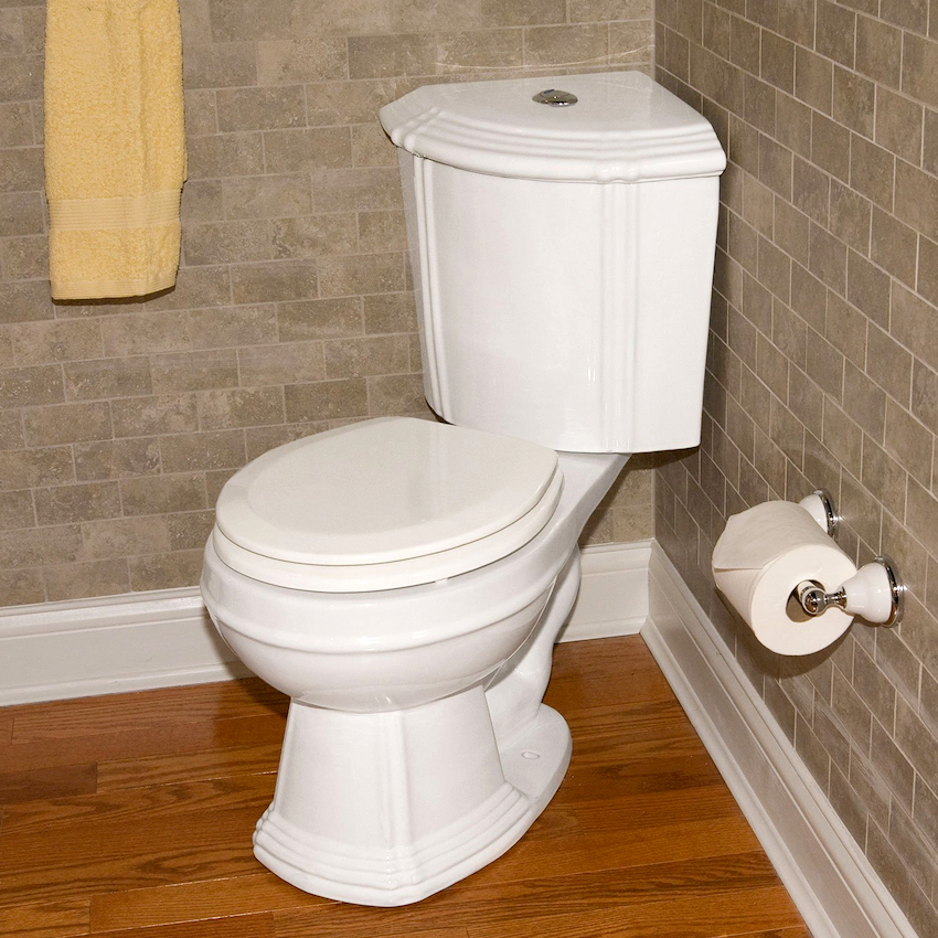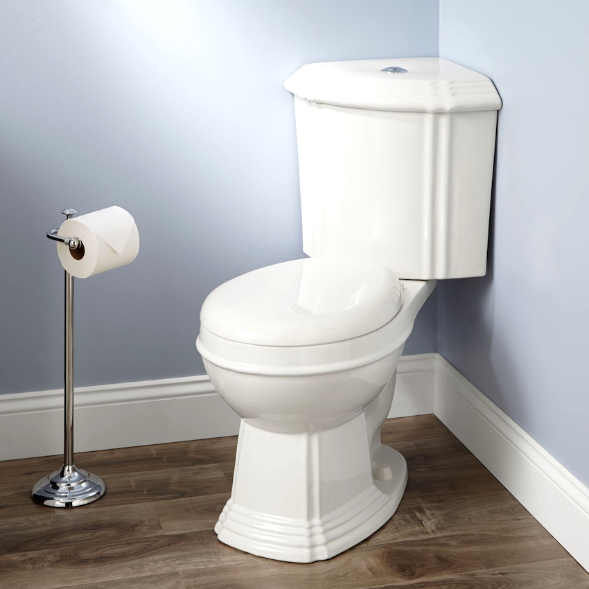 Untuk bilik mandi kecil, monoblock atau model kompak harus diutamakan. Penyelesaian yang munasabah adalah memasang tandas sudut dengan tangki, yang menjimatkan ruang tambahan di dalam bilik.