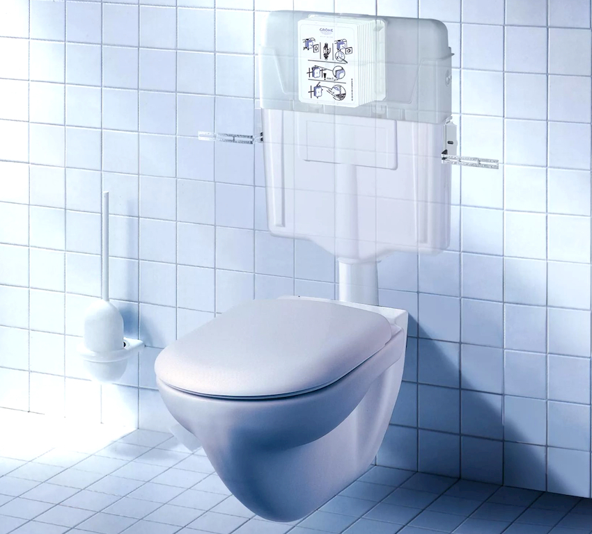 Tangki tandas terbina dalam (di dinding) tersembunyi di ceruk tertutup khas. Hanya butang untuk mengalirkan air keluar, melalui lubang di mana pemeriksaan dan pembaikan alat pencegahan dilakukan. Memilih tangki tandas tersembunyi menyumbang kepada reka bentuk estetik dalaman bilik mandi. Dalam kes ini, tandas akan berada dekat dengan dinding, yang akan menjadikan bilik lebih luas dan kemas. Terdapat juga versi produk yang dipasang di dinding dengan tangki sampah terbina dalam.