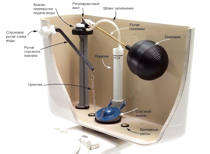 Sistem pembilasan tandas moden terdiri daripada alat tutup, injap pengisian dan sistem yang menghalang limpahan air. Kompleks unsur-unsur seperti itu dapat diwakili sebagai struktur padat atau terdiri daripada bahagian-bahagian yang terpisah.