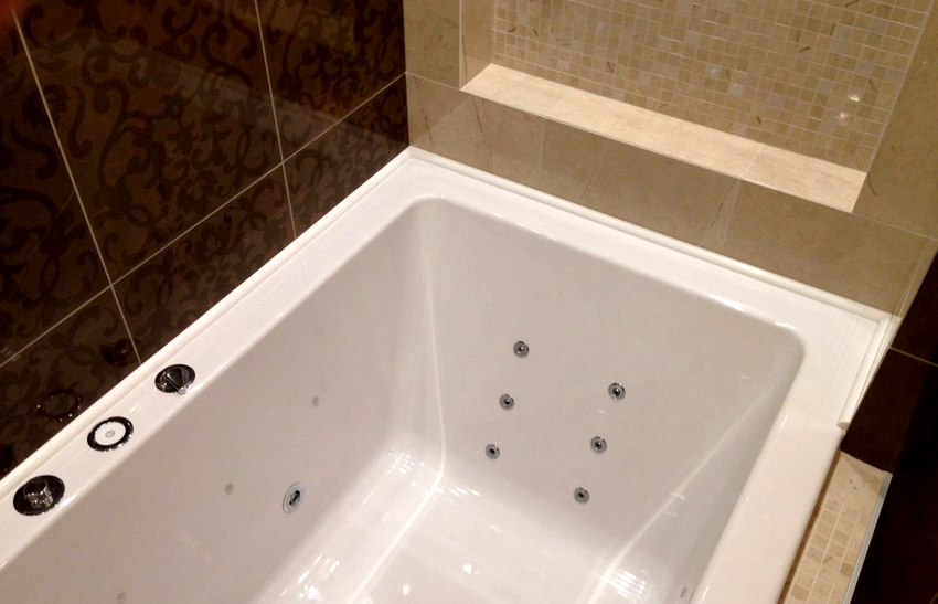 - Sudut. Kelihatannya seperti alas, terutama digunakan untuk menyembunyikan jurang besar antara dinding dan sisi tab mandi.