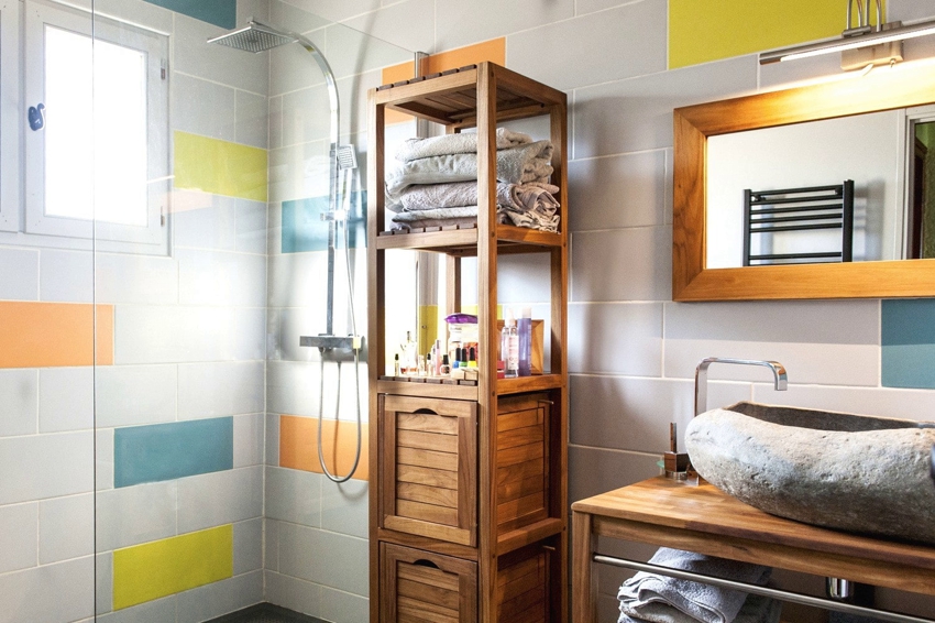 Sebuah ceruk mendatar di dinding bilik mandi dengan rak secara organik akan kelihatan di atas singki atau di atas tab mandi, berkat kaedah prosedur kebersihan secara harfiah "di tangan". Celah menegak biasanya dilengkapi dengan tiga atau lebih rak. Sistem simpanan ini boleh disusun di atas mesin basuh, tandas atau di dinding bebas yang ada.