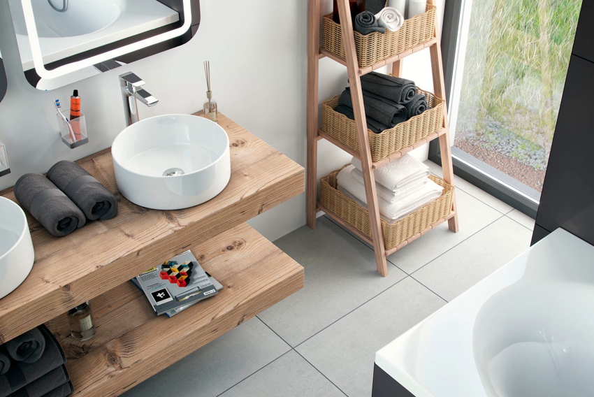 Produk kayu sesuai dengan jubin seramik, akrilik, kaca dan kontras dengan kilauan krom peralatan sanitasi.Mereka sesuai dengan gaya romantis Provence, minimalis yang ketat, loteng mewah, gaya Skandinavia oriental atau terkawal. Foto rak di bilik mandi menunjukkan pilihan reka bentuk yang berbeza dan lokasinya di dalam bilik.