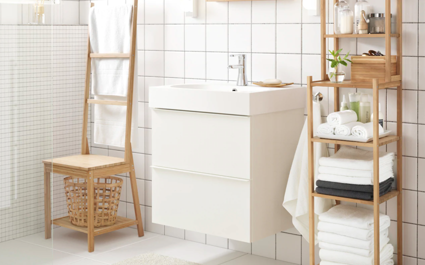 Jati secara tradisional digunakan dalam pembuatan kapal, yang dicirikan oleh kualiti tahan kelembapan yang sangat baik. Kayu ini mempunyai warna unik yang merangkumi banyak warna, mulai dari emas hingga coklat kemerahan. Rak kayu jati di bilik mandi digabungkan dengan peralatan sanitasi putih salji.