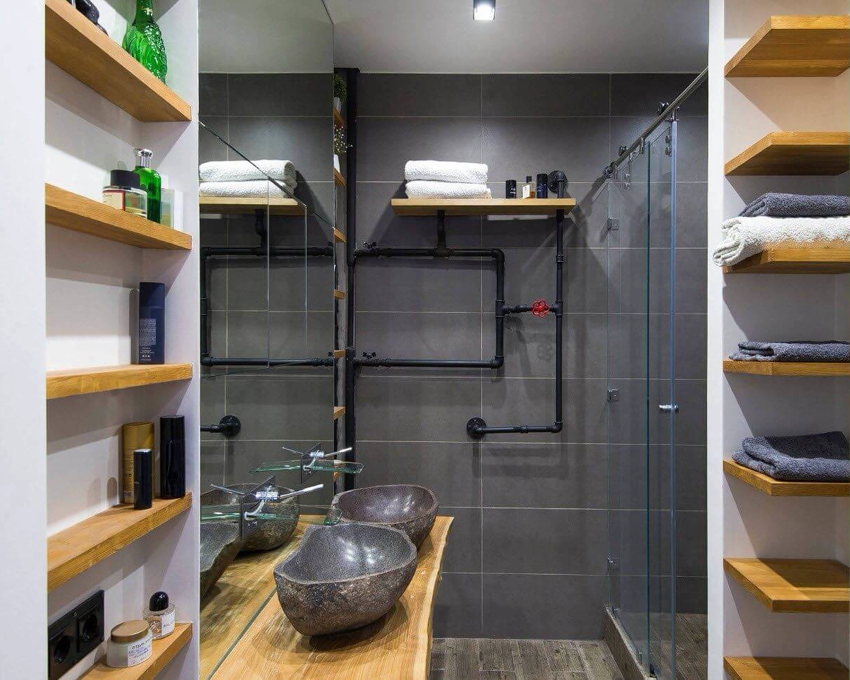 Pilihan menarik untuk rak berengsel do-it-yourself di bilik mandi