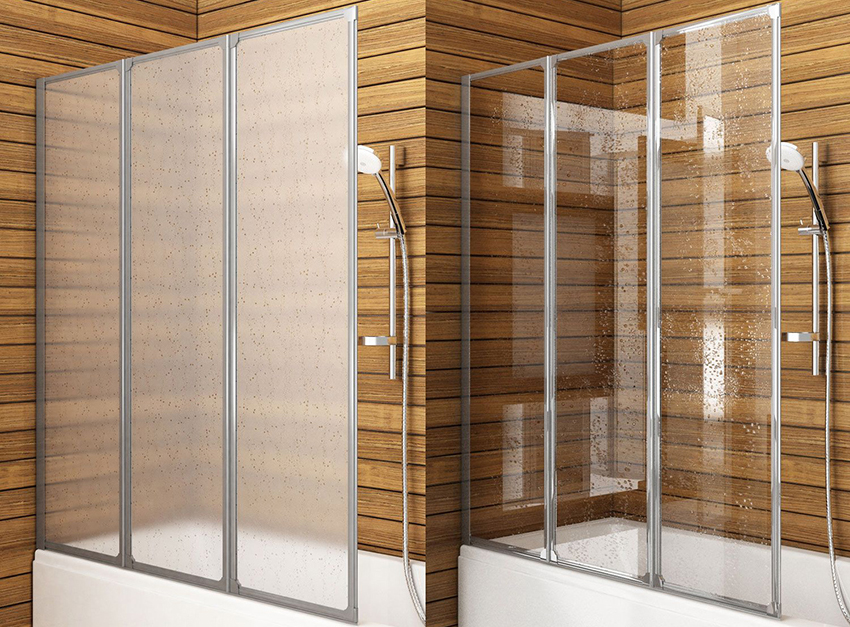 Elemen pelindung bilik mandi diperbuat daripada kaca akrilik atau tahan hentaman. Pintu dan dinding akrilik berbeza warna dan ketelusan. Filem hiasan dengan corak dapat digunakan pada permukaan, yang dipilih untuk bahagian dalam ruangan tertentu. Bahan ini menuntut dalam penjagaan. Selepas setiap rawatan air, permukaan harus segera dibersihkan. Jika tidak, noda akan tetap ada di atasnya, yang tidak dapat dihilangkan dari masa ke masa, yang akan menyebabkan keruh struktur. Anda boleh membeli pintu pancuran akrilik dalam ceruk 100 cm dari 18 ribu rubel.