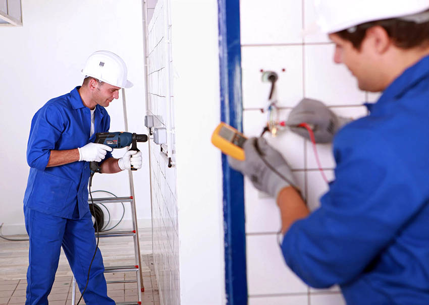 Acara penting ialah pendawaian baru. Kabel, tertutup dalam paip bergelombang, tersembunyi di dinding. Untuk bilik mandi, anda harus membeli soket dengan rintangan kelembapan yang meningkat. Setelah meletakkan semua komunikasi, alur diisi dengan campuran simen-pasir atau gipsum.