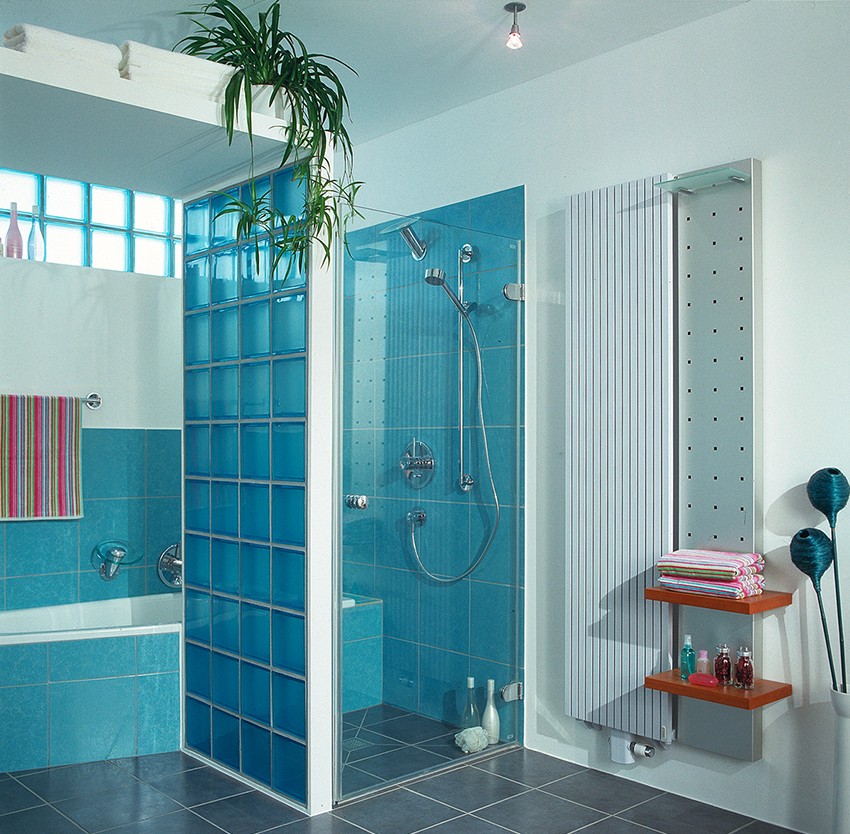 Penyelesaian tradisional adalah dengan membuat dinding struktur dari papan eternit tahan kelembapan, diikuti dengan menghadap permukaan dengan jubin seramik. Anda boleh mendapatkan ruang yang hangat dan terang dengan membina pancuran dari blok kaca. Masonry cepat dan membolehkan anda membuat sebarang bentuk pagar. Sisipan jubin hiasan yang meniru batu semula jadi akan membantu menambahkan keaslian pada reka bentuk ini. Sebaiknya gunakan bahan yang sama untuk menyelesaikan palet.