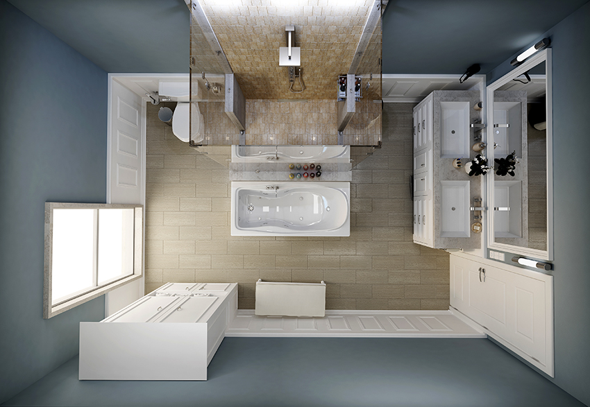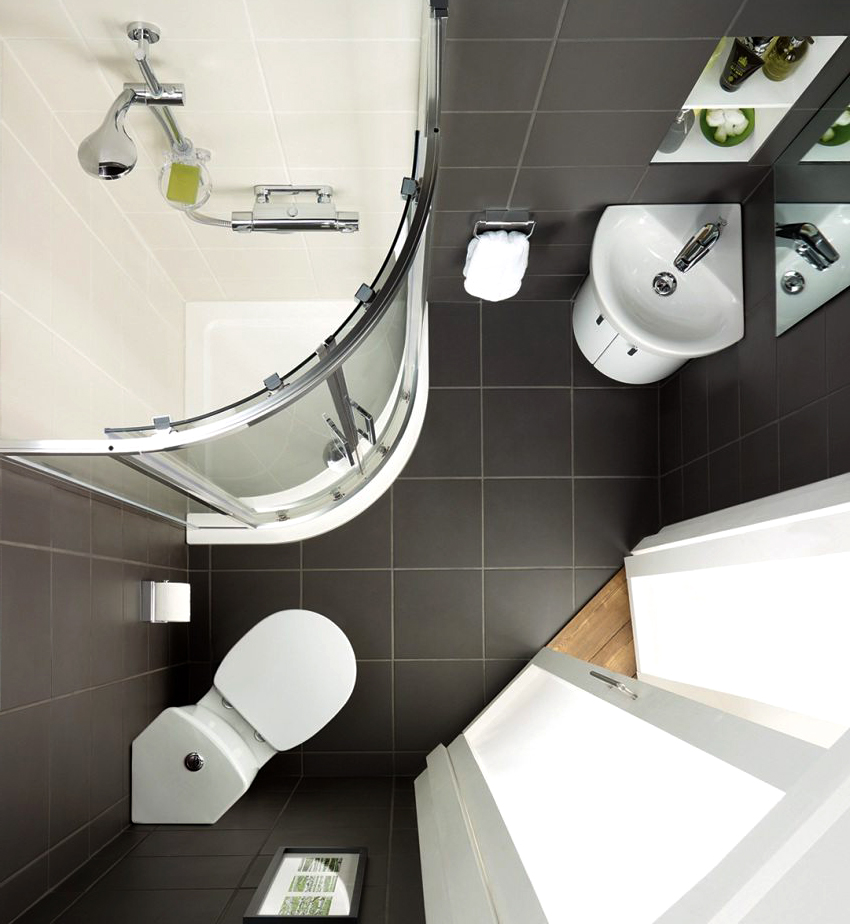 Terdapat pelbagai pilihan untuk merancang bilik mandi kecil. Di sebuah bilik persegi, sebuah bilik mandi terletak di sudut. Singki dipasang berhampiran. Mangkuk tandas diletakkan di seberang bilik, jika boleh, ditutup dengan partition. Di bilik segi empat, bilik boleh dipasang di sepanjang satu dinding lebar, di seberang terdapat tandas dan sink. Di bilik yang sempit, lekapan paip hendaklah diletakkan di sepanjang salah satu dinding panjang.