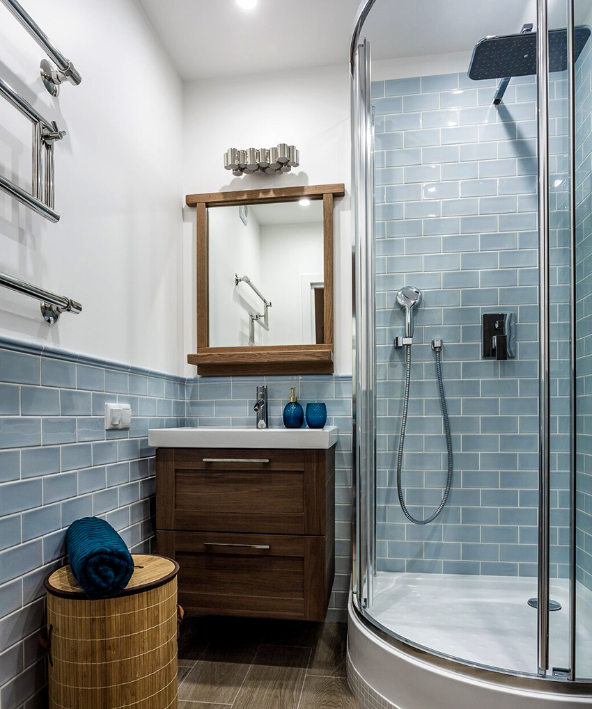 Untuk pangsapuri kecil, bilik mandi gabungan dengan pancuran mandian sering dilakukan. Struktur biasanya menempati kawasan seluas sekurang-kurangnya 1 m². Anda juga dapat menjimatkan ruang dengan memasang sink dan tandas berengsel. Dianjurkan untuk mengatur kabinet di bawah singki untuk pelbagai aksesori mandi.
