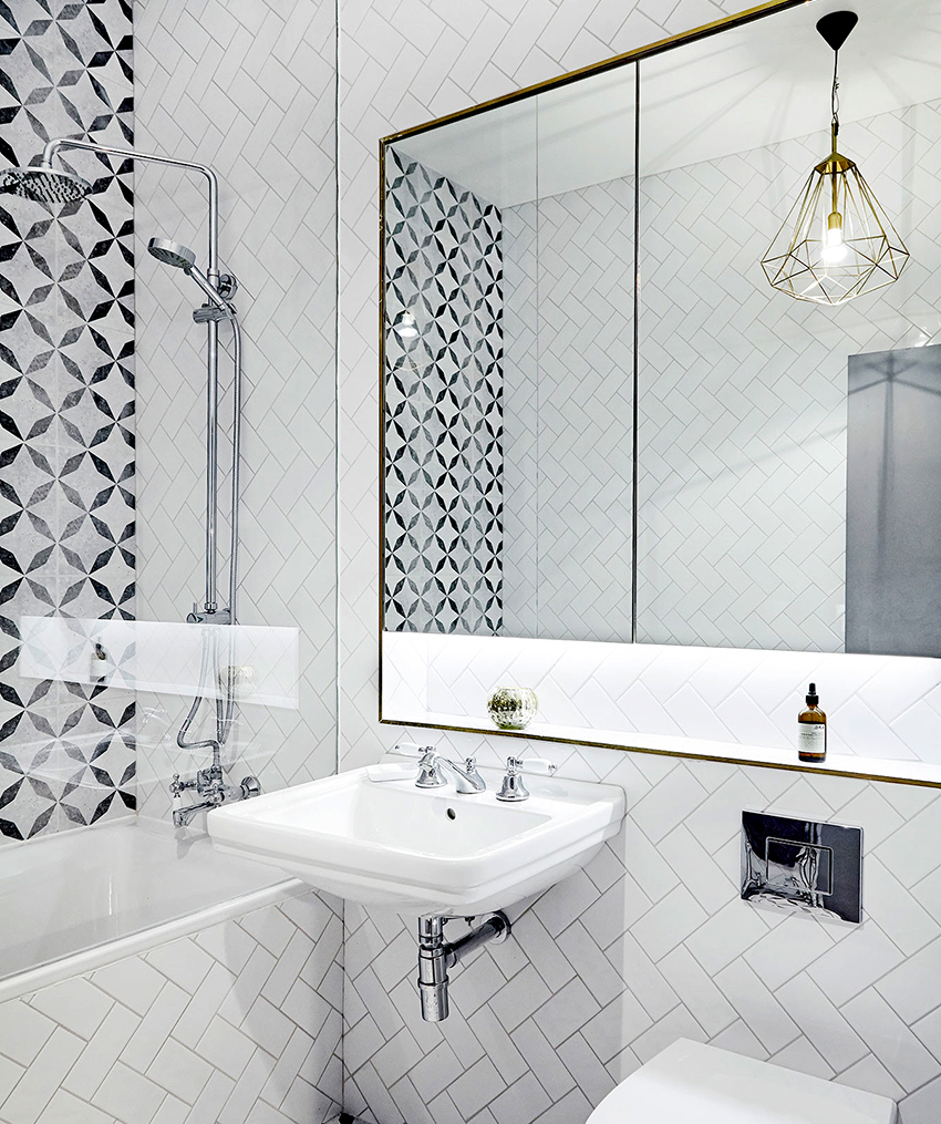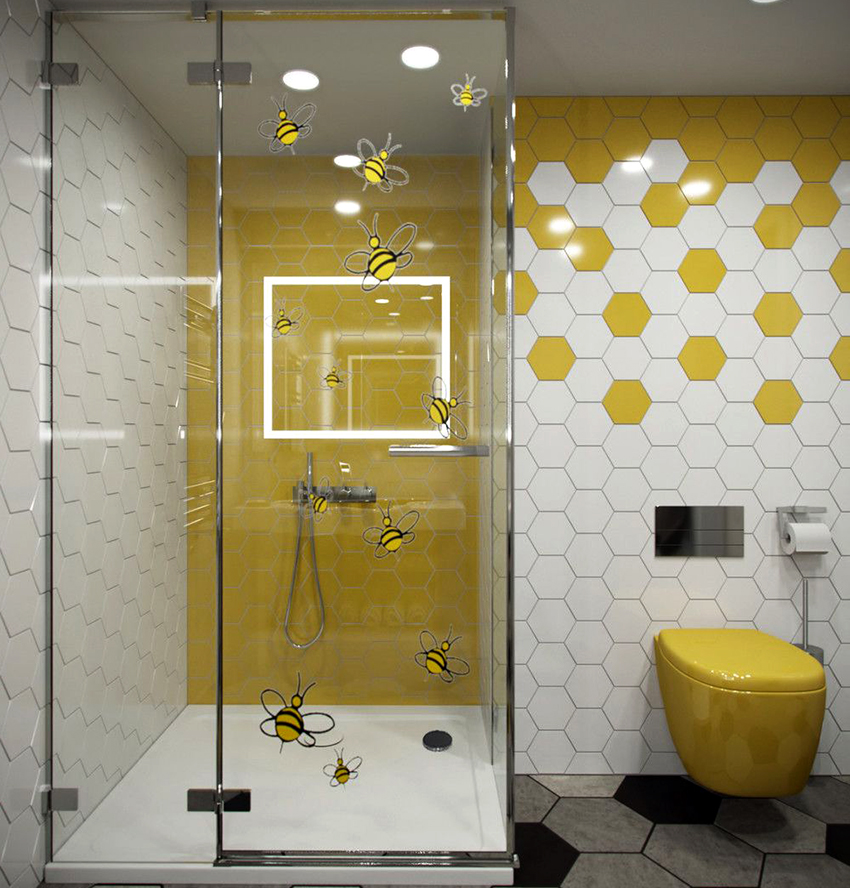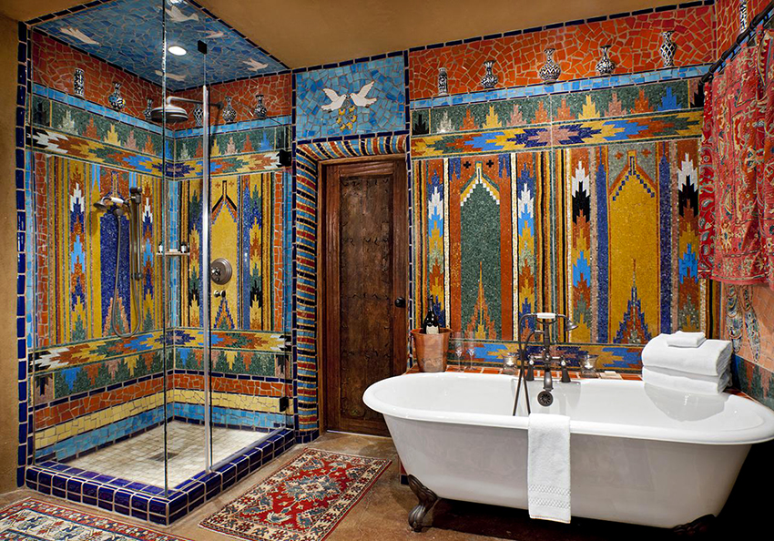 Jubin seramik berkilat atau separa berkilat dengan unsur reflektif akan kelihatan harmoni. Lukisan besar tidak boleh digunakan. Bilik mandi yang diperbuat daripada mozek atau jubin tradisional dengan corak geometri orientasi menegak kelihatan paling harmoni. Anda boleh menambah kontras dengan melengkapkan lantai gelap dan memilih aksesori dalaman yang terang. Ini boleh menjadi karpet lantai berwarna, tuala atau langsir berpola.