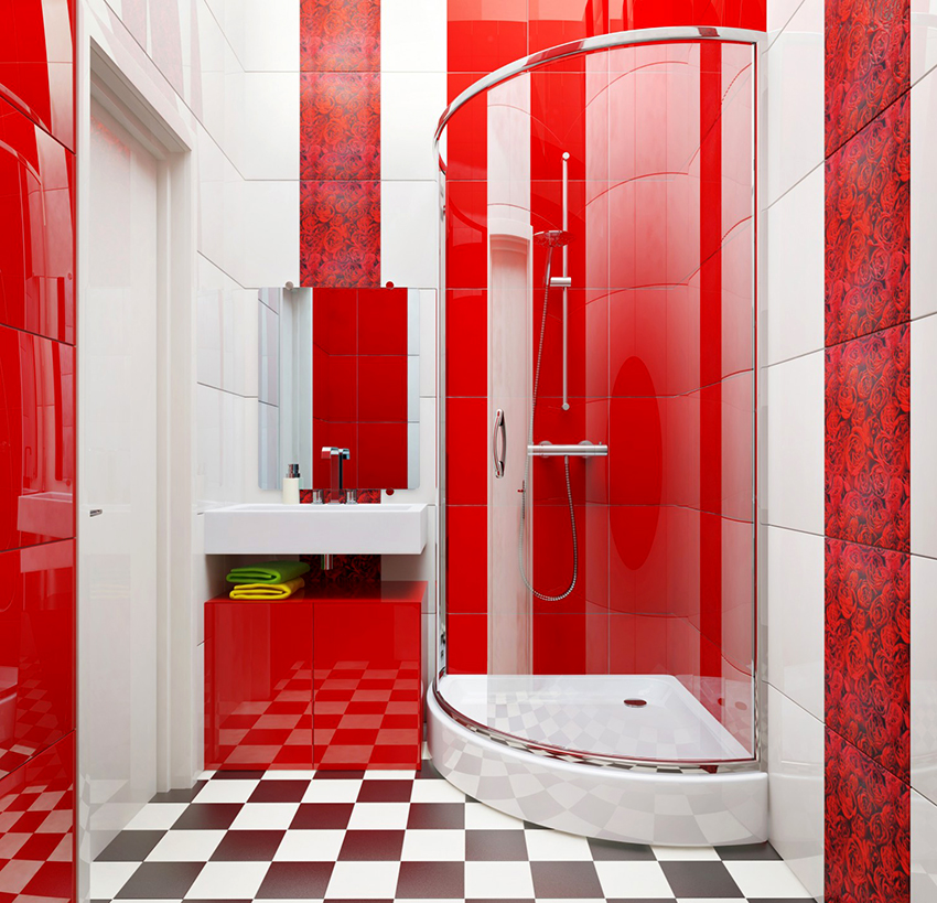 Bilik-bilik yang dihiasi dengan kontras warna ungu dan kuning, merah dan putih, kuning dan biru, merah dan kelabu akan kelihatan asli, yang jelas ditunjukkan dalam foto reka bentuk bilik mandi kecil dengan pancuran mandian.