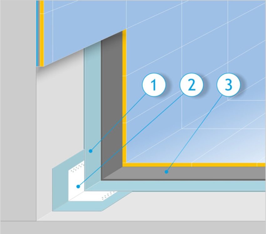Skema susunan kalis air lapisan: 1 - komposisi tahan kelembapan polimer; 2 - pita untuk lipit; 3 - pelekat jubin