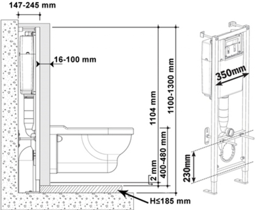 Dimensi pemasangan minimum untuk tandas jenis blok biasanya tidak terlalu berbeza dengan struktur kerangka: kedalaman dalam kes ini adalah 10-15 cm, tingginya 1 m. Penting untuk diperhatikan bahawa dalam beberapa keadaan, pemasangan tangki tersembunyi dan mangkuk tandas yang boleh digantung dilakukan secara berasingan terus ke dinding.