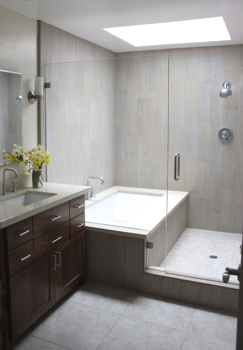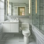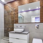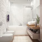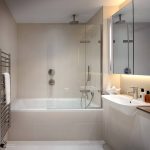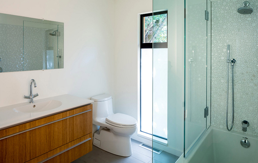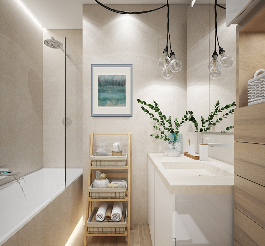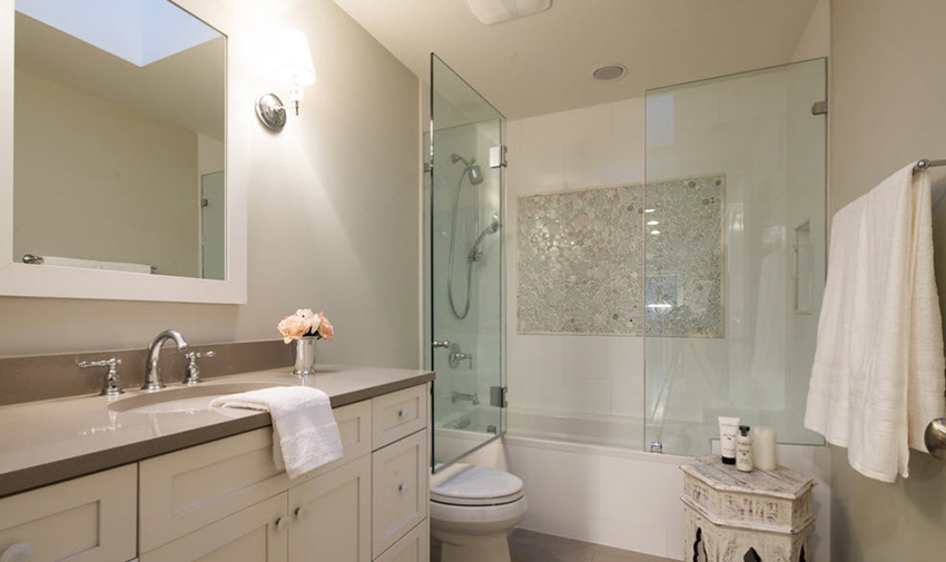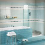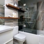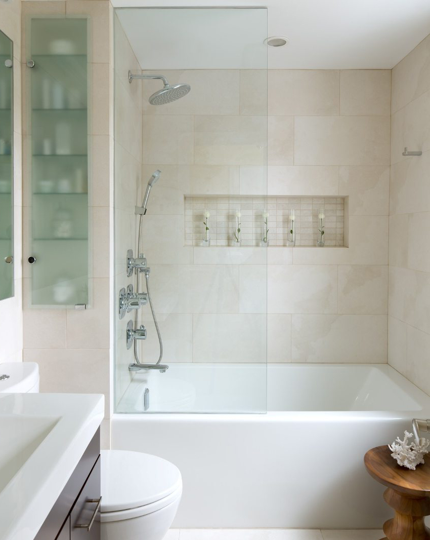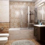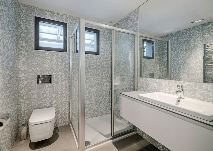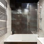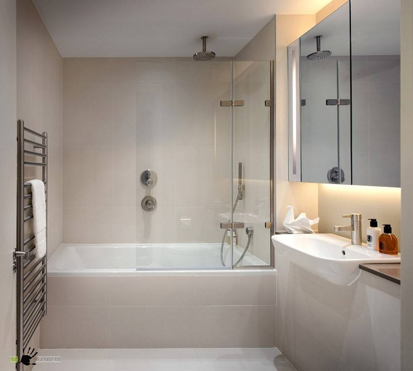 Nasihat berguna! Sekiranya anda menggunakan kaca buram untuk mandi di bilik mandi kecil, maka anda perlu menjaga pencahayaan tambahan di dalam bilik.