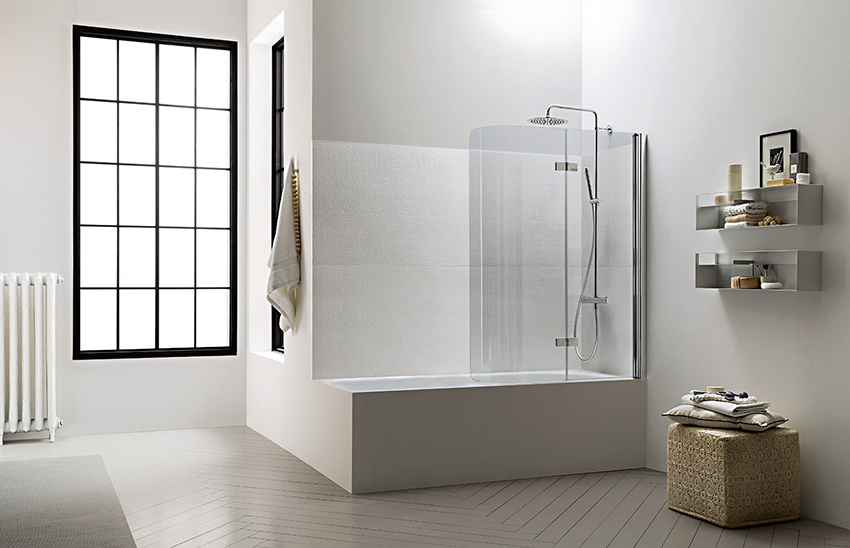 Pilihan yang paling serba boleh dan sederhana adalah kepingan kaca lutsinar tanpa penggunaan kelengkapan. Anda boleh mengubah penampilan produk sedemikian dengan bentuk asal. Sebarang penyimpangan dari bentuk segi empat akan menambahkan keunikan dan daya tarikan luar biasa pada bahagian dalam bilik mandi. Di samping itu, anda boleh melukis tirai seperti cat atau pelekat kalis air yang direka khas untuk bilik mandi. Pilihan ini sesuai untuk premis bersaiz besar, kerana tidak meluaskan ruang. Model-model ini kelihatan harmoni dengan gaya minimalis.