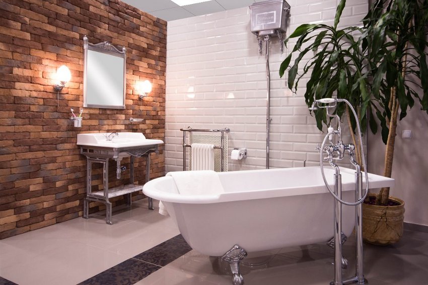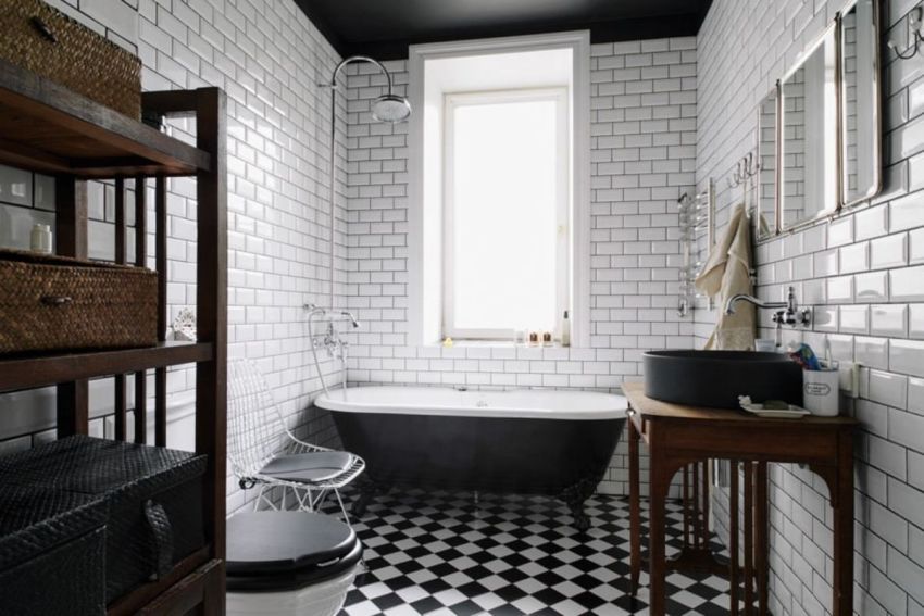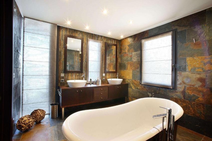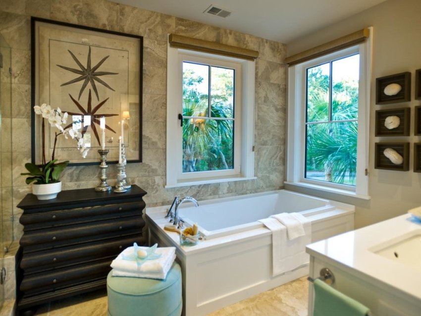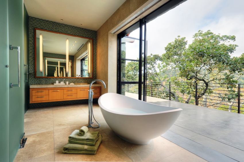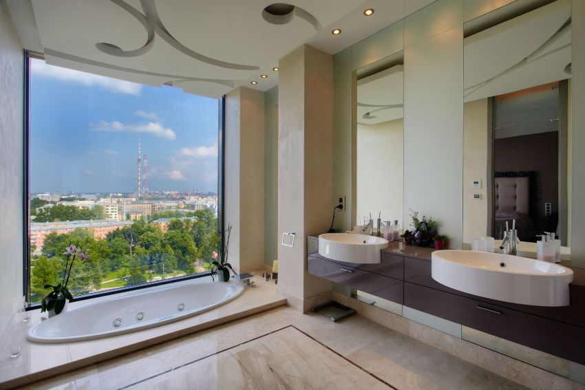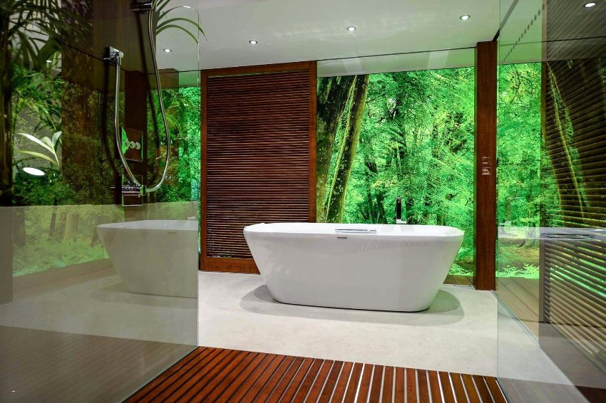 Nasihat berguna! Sekiranya bilik mandi di rumah persendirian mempunyai tingkap, maka lebih baik meletakkan tab mandi di seberang sehingga anda boleh berehat sambil mengagumi pemandangan ruang hijau. Dianjurkan untuk mengatur pilihan ini di ruangan yang terletak di tingkat dua, dan sekiranya tingkap tidak menghadap rumah jiran.