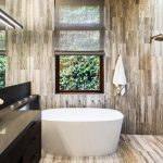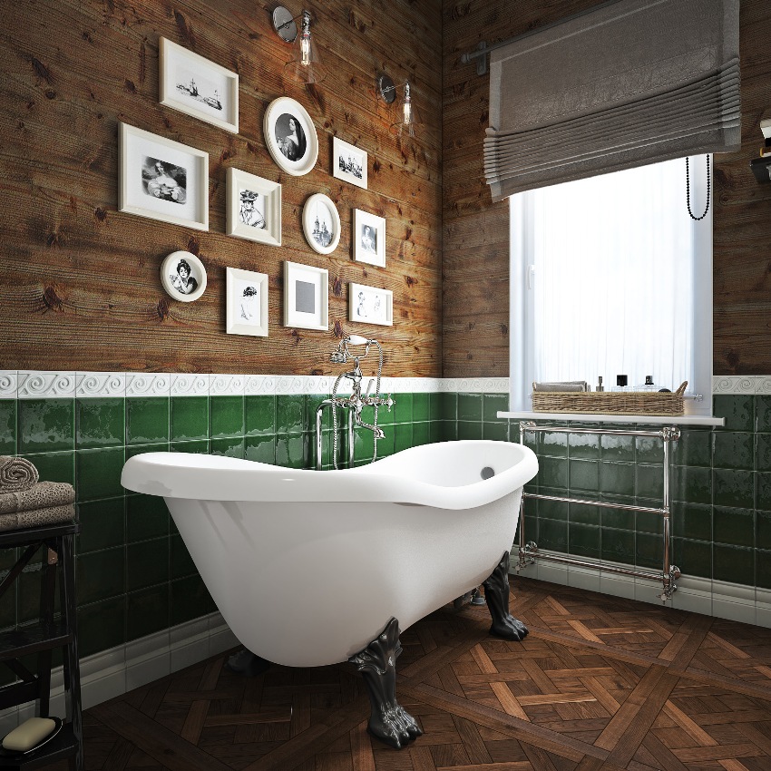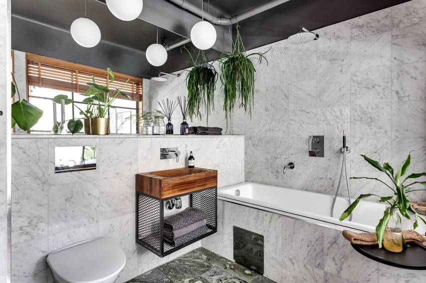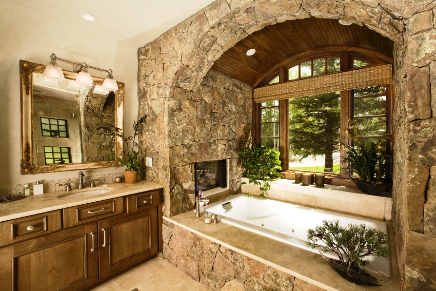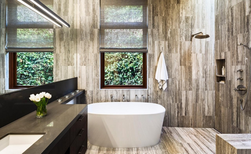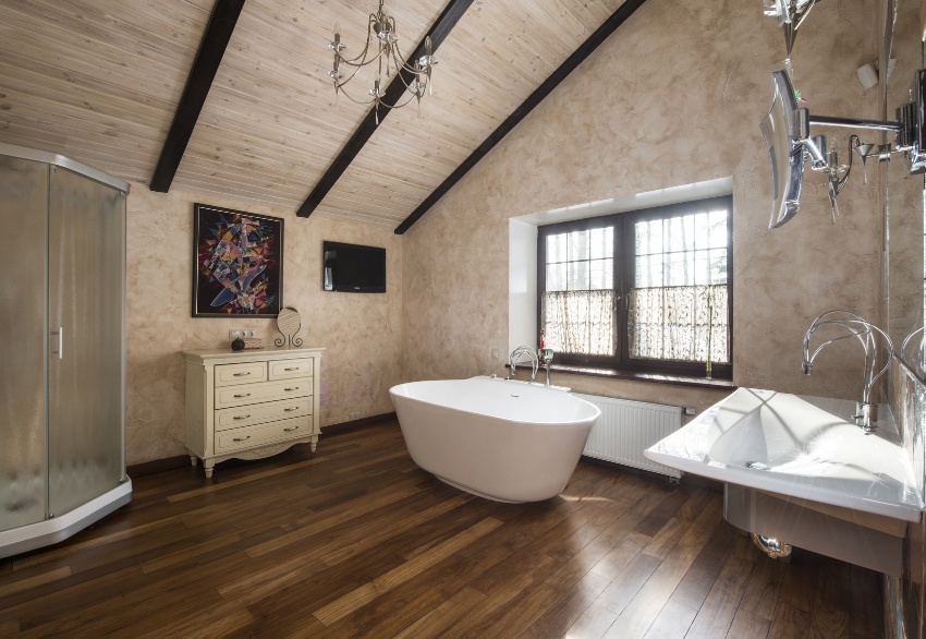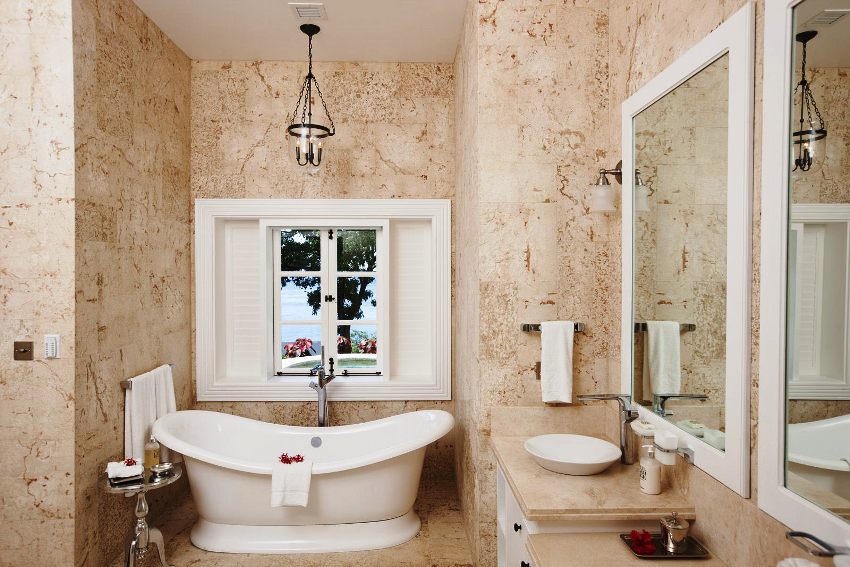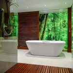 Nasihat berguna! Sekiranya bilik mandi di rumah persendirian mempunyai tingkap, maka lebih baik meletakkan tab mandi di seberang sehingga anda boleh berehat sambil mengagumi pemandangan ruang hijau. Dianjurkan untuk mengatur pilihan ini di ruangan yang terletak di tingkat dua, dan sekiranya tingkap tidak menghadap rumah jiran.