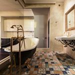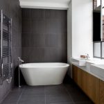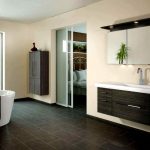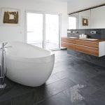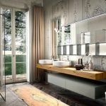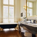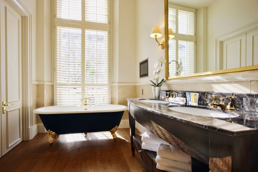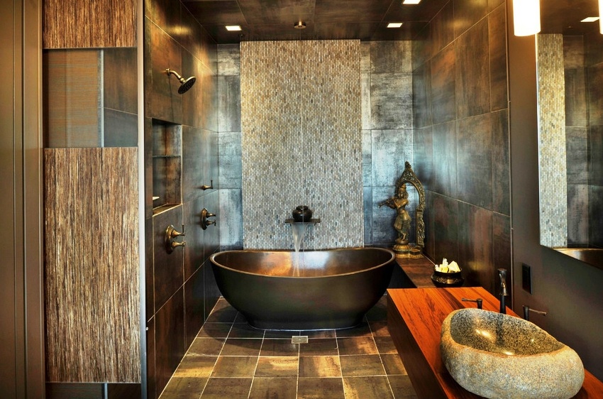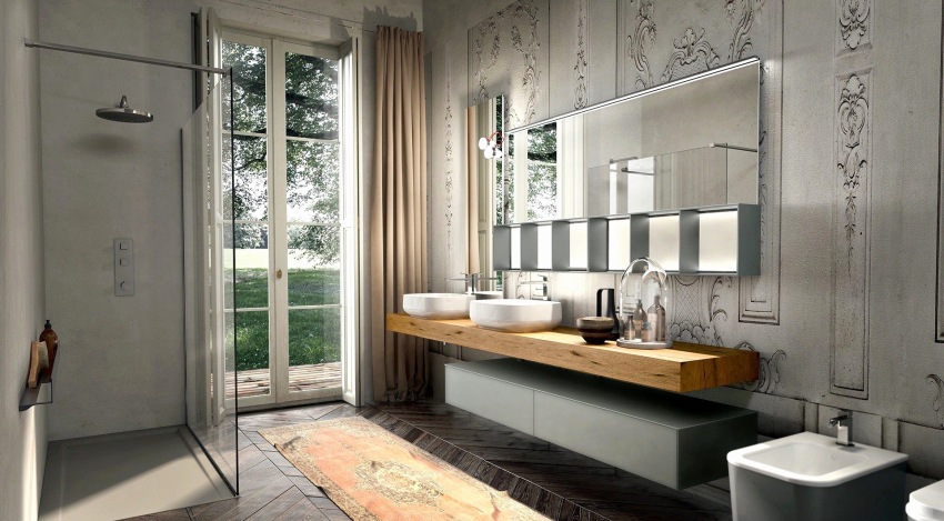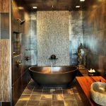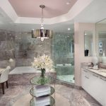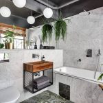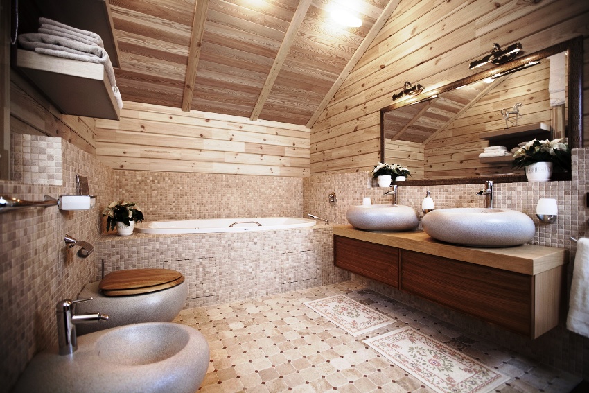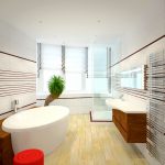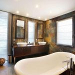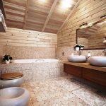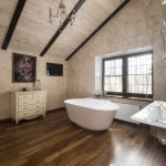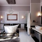 Bukan hanya mangkuk di alas yang kelihatan menarik di ruangan besar, tetapi juga model pada kaki yang tidak biasa dan cantik, dipasang di tengah-tengah bilik. Sebuah singki terpasang di sebelah tempat mandi, dan tandas dan urin dipisahkan dari kawasan utama. Sekiranya beberapa wanita menggunakan bilik mandi pada masa yang sama, sebilangan besar rak, laci dan kabinet untuk kosmetik akan lebih berguna daripada sebelumnya. Semasa pembangunan projek bilik mandi, anda perlu mengambil kira butiran sedemikian rupa sehingga pada pandangan pertama kelihatan tidak penting: