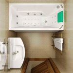 Nasihat berguna! Sekiranya tab mandi biasa tidak sesuai dengan ruang dari segi dimensi, lebih baik memilih model sudut. Walaupun mangkuk akan mengambil kawasan yang sama, ia akan menggunakan kawasan sudut yang tidak dituntut dan mengosongkan ruang di tengahnya. Lebih baik memberi keutamaan untuk menggantung perabot sudut, yang kelihatan lebih harmoni di bilik mandi kecil.
