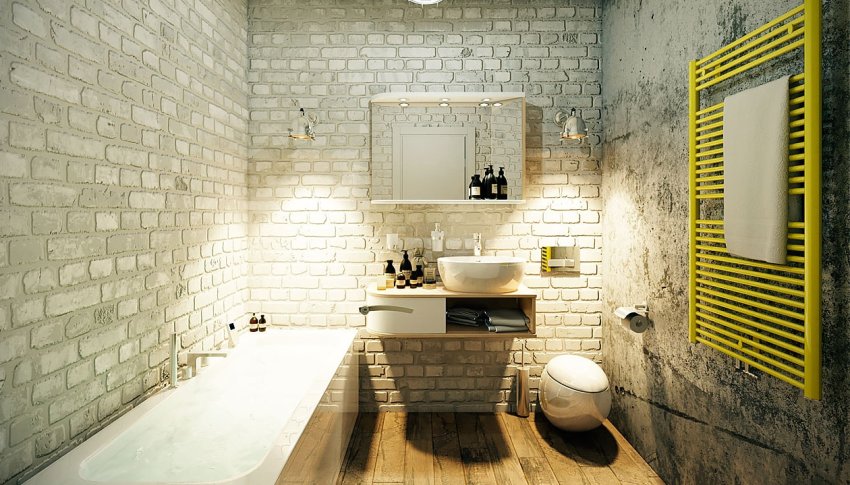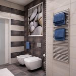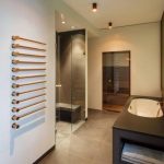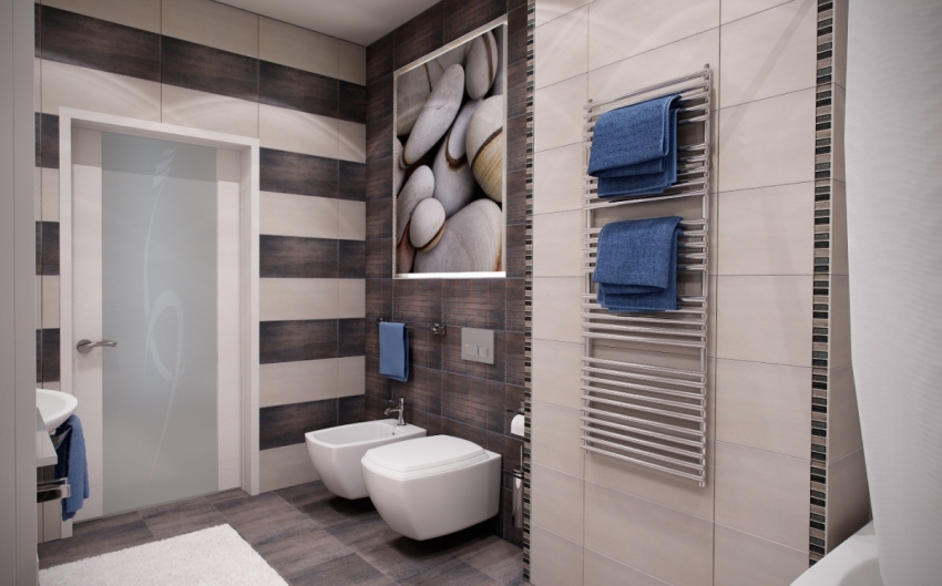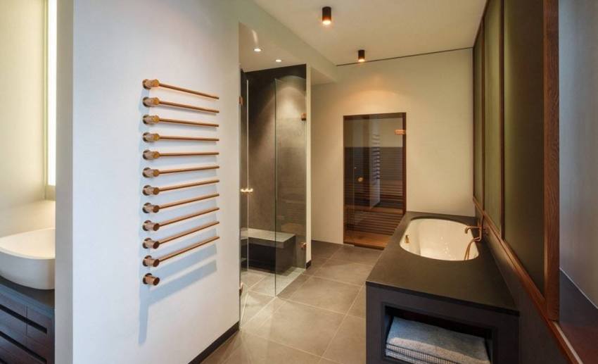 Kita tidak boleh melupakan elemen wajib seperti rel tuala yang dipanaskan, yang disyorkan dipasang tidak lebih dari 50-70 cm ke bilik mandi atau mandi. Jarak inilah yang cukup untuk menjangkau alat dan melepaskan tuala kering dengan bebas.