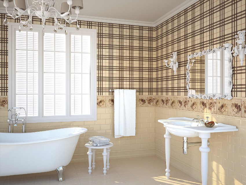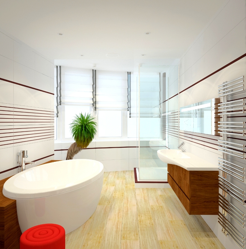 Semasa mengatur reka bentuk bilik mandi standard, yang mempunyai bentuk segi empat tepat atau persegi, lebih baik meletakkan semua peralatan di sepanjang dinding sehingga ada ruang yang cukup di tengah-tengah ruangan untuk keluar normal dari tab mandi atau dekat sink.