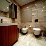 Di bilik mandi besar dengan luas 5 m², anda tidak dapat menjimatkan jumlah paip dan bahkan memilih aksesori tambahan, misalnya, memasang bidet atau urin. Untuk memberikan keakraban di ruangan seperti itu, anda perlu memisahkan tandas dengan partisi rendah dan, jika dikehendaki, buat singki kecil di dekatnya untuk mencuci tangan.