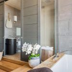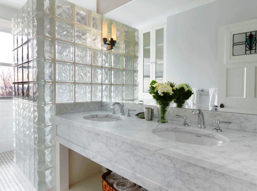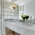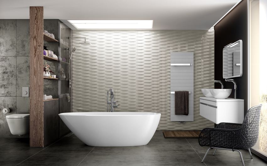 Kehadiran bilik mandi yang besar memberikan banyak kelebihan kepada pemiliknya. Di ruang yang begitu besar, pengezonan mesti dilakukan dengan betul. Sebagai contoh, dengan menggunakan hiasan dinding eternit, anda boleh membahagikan bilik yang besar dan mengatur bilik mandi tetamu tambahan dengan pintu masuk yang berasingan.