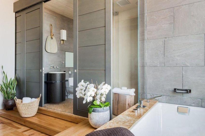 Sekiranya terdapat bilik mandi berasingan dengan tandas berhampiran bilik mandi kecil, lebih baik menggabungkan bilik-bilik ini. Dalam beberapa kes, adalah mungkin untuk mengambil beberapa kawasan dari bilik bersebelahan. Dalam foto reka bentuk bilik mandi di Khrushchev, anda dapat melihat bagaimana bilik ini dipisahkan dari bilik-bilik bersebelahan dengan menggeser pintu lut, yang tidak mengambil ruang tambahan dari pangsapuri, baik secara visual maupun sebenarnya.