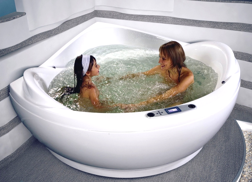 Tab mandi pusaran dua boleh bersaiz besar dan sangat sesuai untuk keluarga dengan anak-anak yang dimandikan dengan selesa pada masa yang sama. Dalam kes ini, anda boleh memilih mandi sudut dengan hydromassage 180x80 atau 170x100 cm - semuanya bergantung pada jumlah ruang kosong.