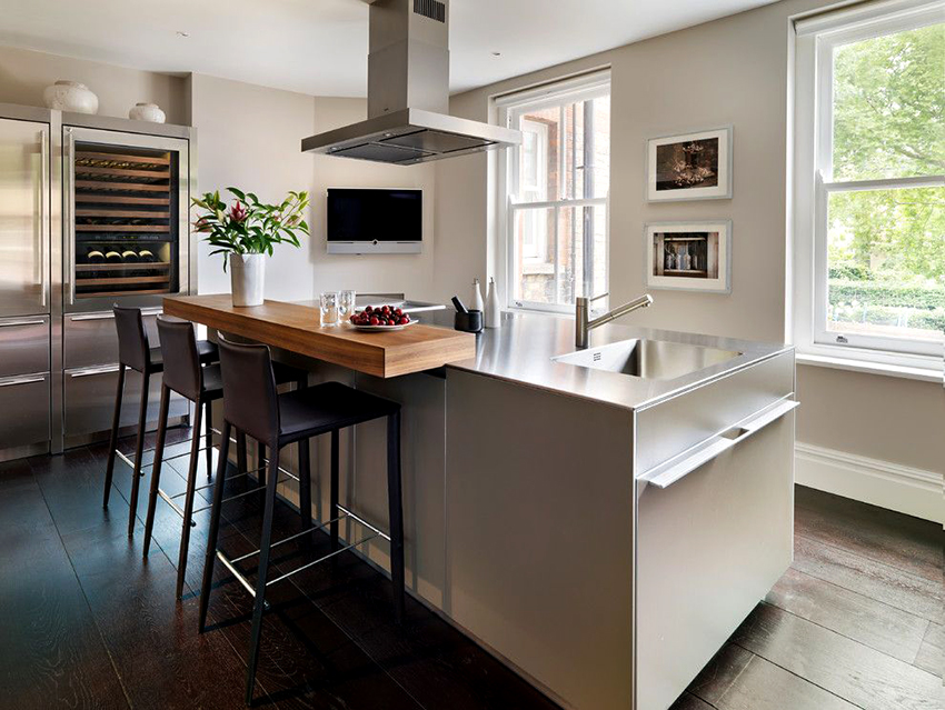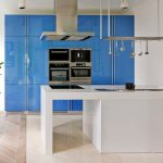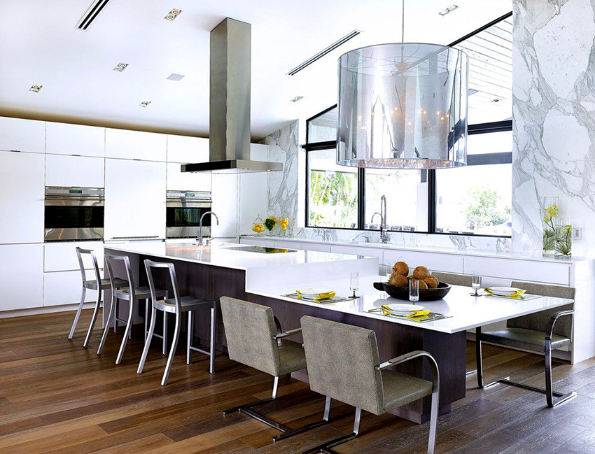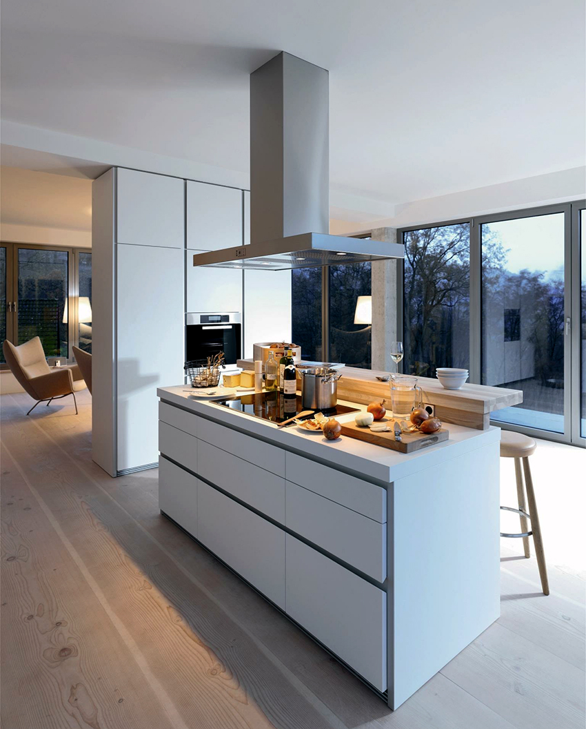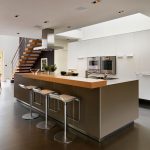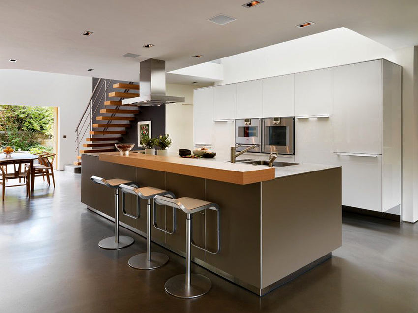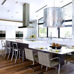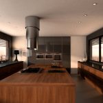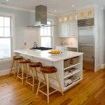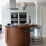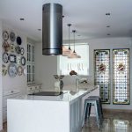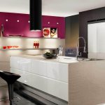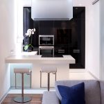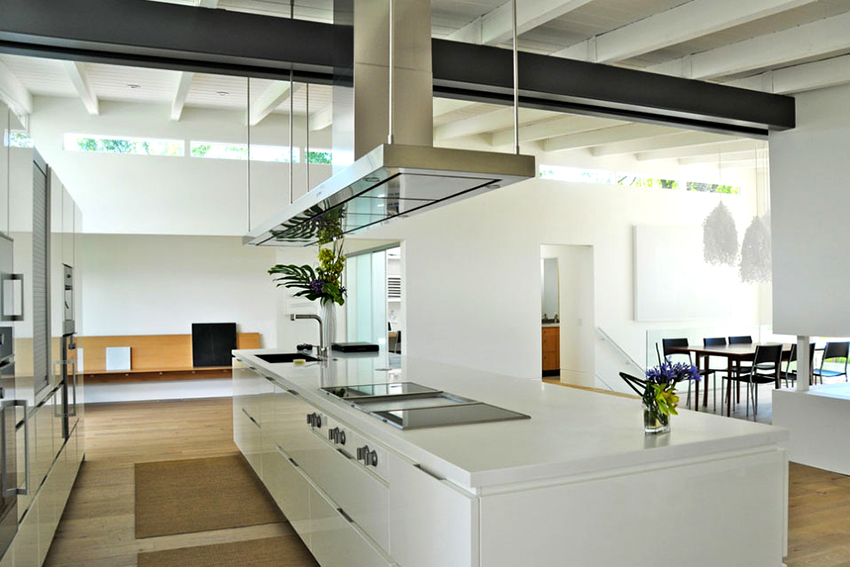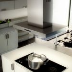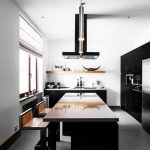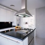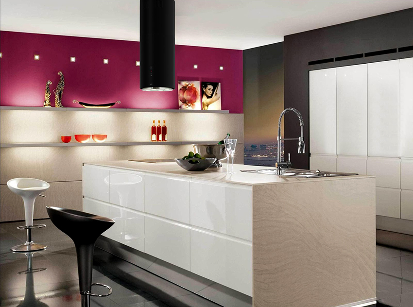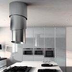 Perlu memberi keutamaan kepada tudung silinder. Bersama dengan sudut bulat meja (ini adalah pilihan), mereka akan membuat komposisi yang sangat baik dan ruang kerja yang selesa di dapur pulau kecil. Tudung berwarna putih atau cahaya yang lain mampu meningkatkan ketinggian bilik secara visual.